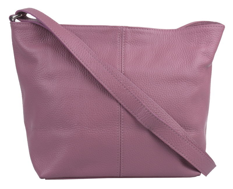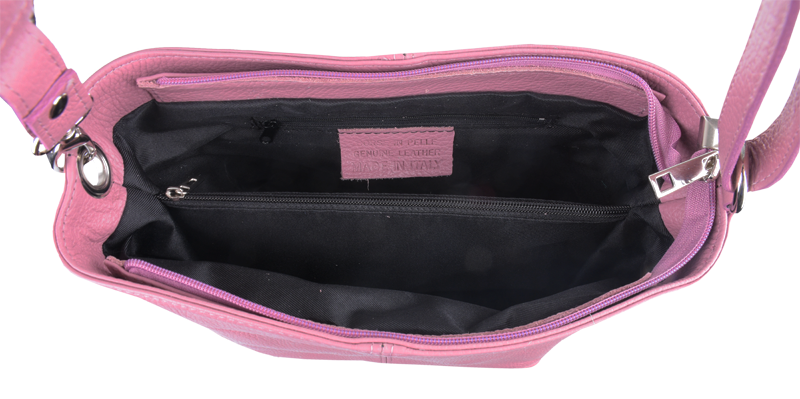 Růžová kabelka nositelná přes rameno či cross-body (křížem). Tato kožená kabelka je uzavíratelná na zip. Uvnitř kabelky najdeme přepážku uprostřed, která zároveň slouží jako kapsa na zip, a na boční stěně pak kapsu na zip. Hloubka jejího dna je 13 cm. Kabelka má navíc nastavitelný popruh s maximální délkou cca 120 cm.