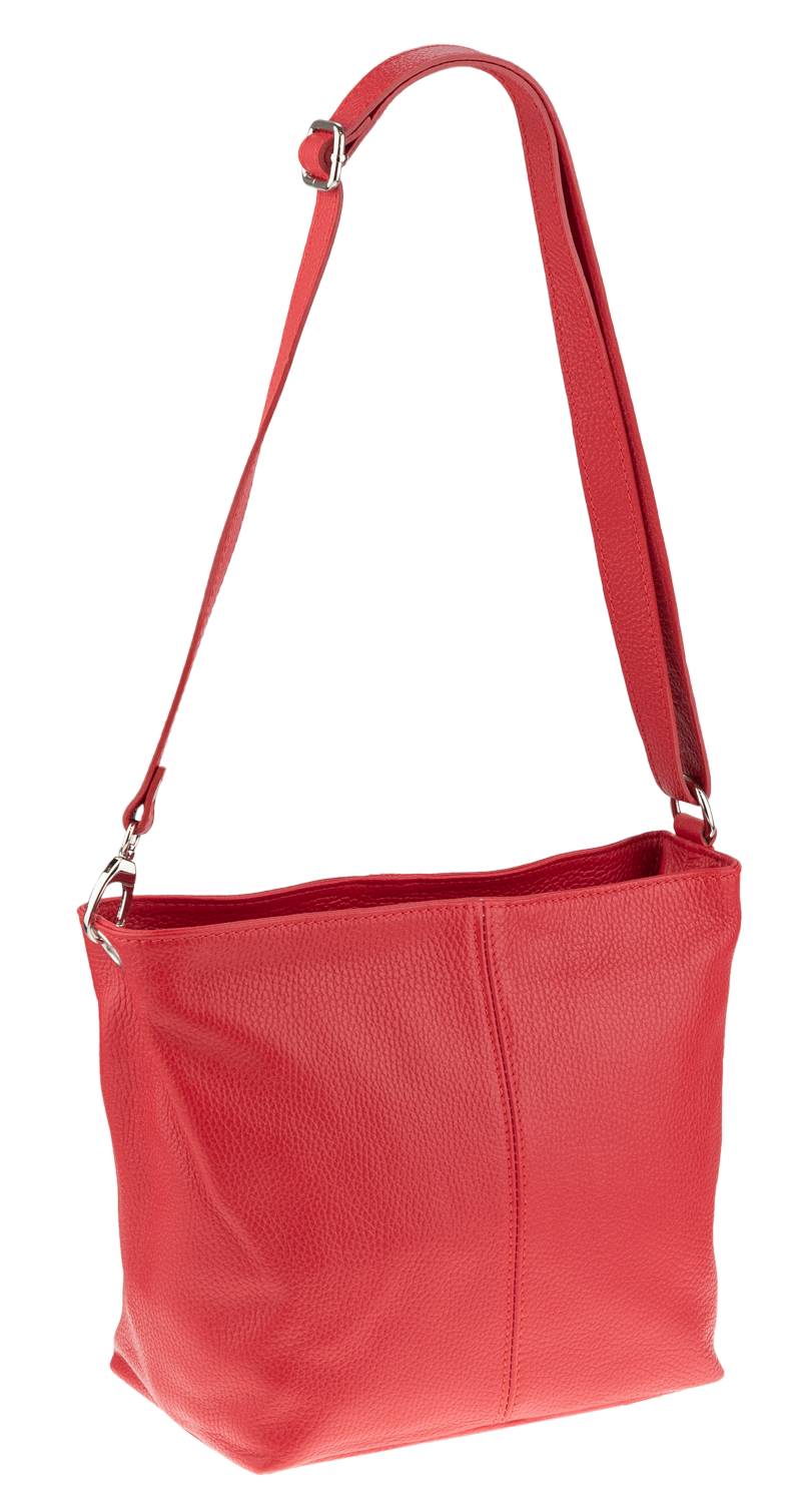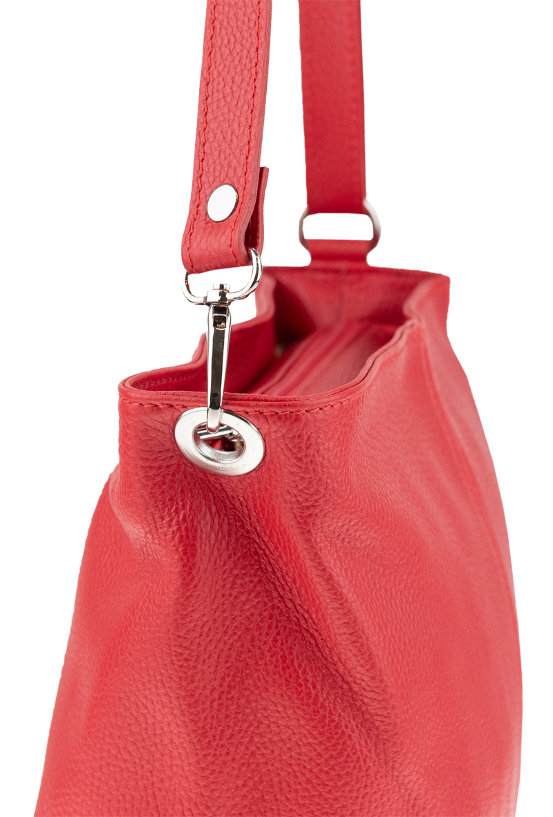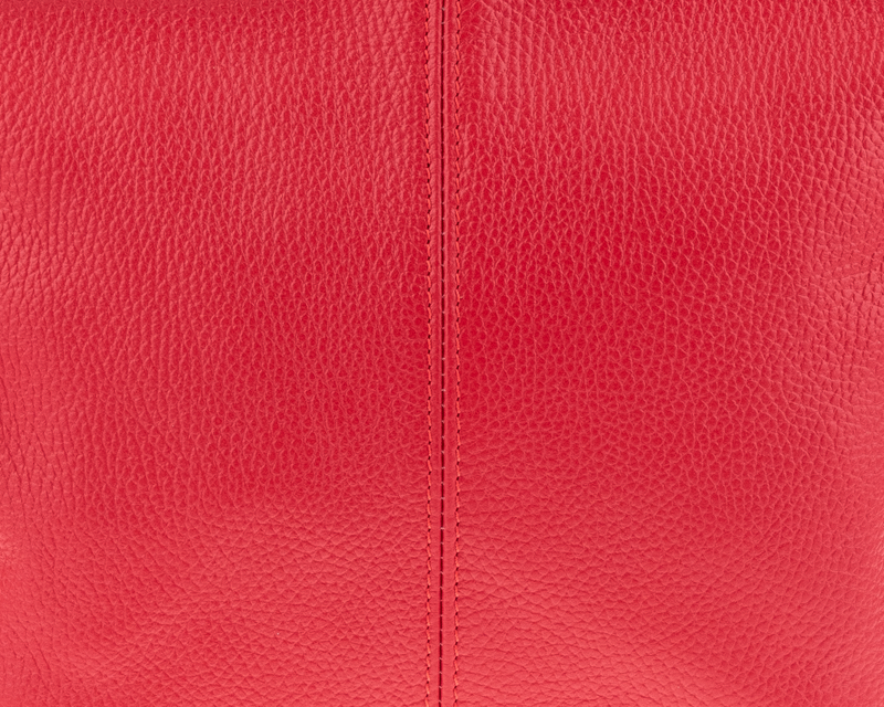 Červená kabelka nositelná přes rameno či cross-body (křížem). Tato kožená kabelka je uzavíratelná na zip. Uvnitř kabelky najdeme přepážku uprostřed, která zároveň slouží jako kapsa na zip, a na boční stěně pak kapsu na zip. Hloubka jejího dna je 13 cm.