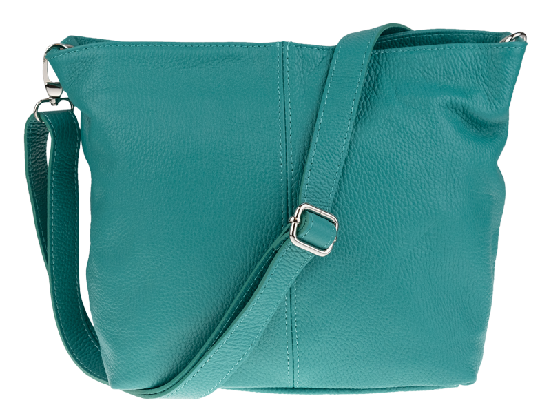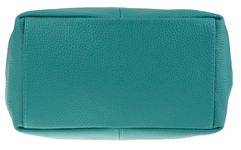 Tyrkysová kabelka nositelná přes rameno či cross-body (křížem). Tato kožená kabelka je uzavíratelná na zip. Uvnitř kabelky najdeme přepážku uprostřed, která zároveň slouží jako kapsa na zip, a na boční stěně pak kapsu na zip. Hloubka jejího dna je 13 cm.