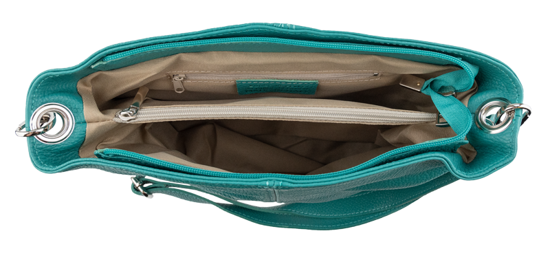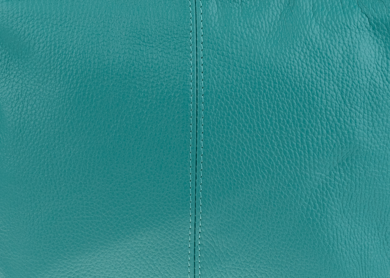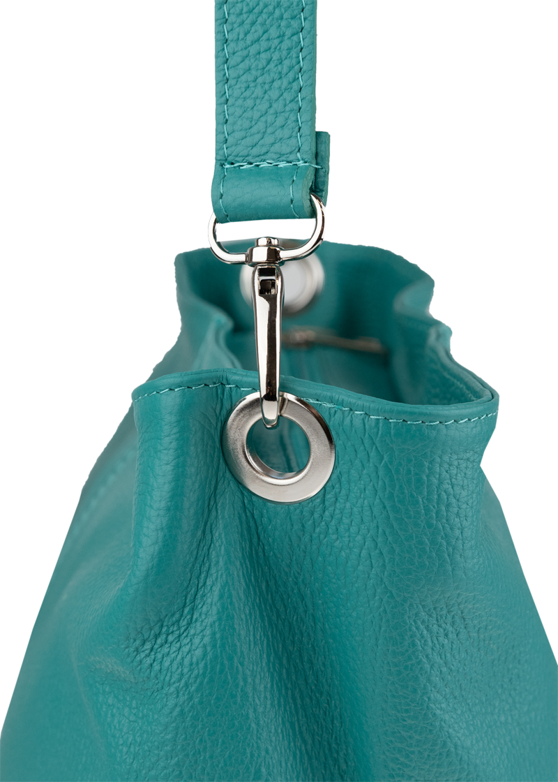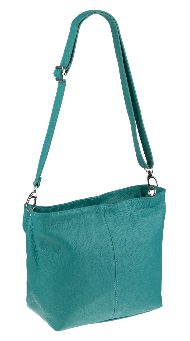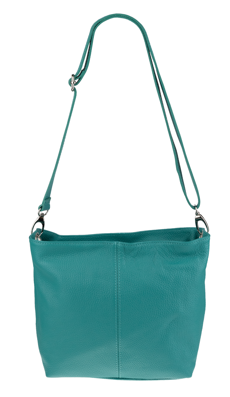 Tyrkysová kabelka nositelná přes rameno či cross-body (křížem). Tato kožená kabelka je uzavíratelná na zip. Uvnitř kabelky najdeme přepážku uprostřed, která zároveň slouží jako kapsa na zip, a na boční stěně pak kapsu na zip. Hloubka jejího dna je 13 cm.