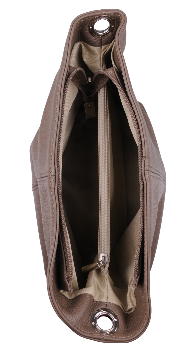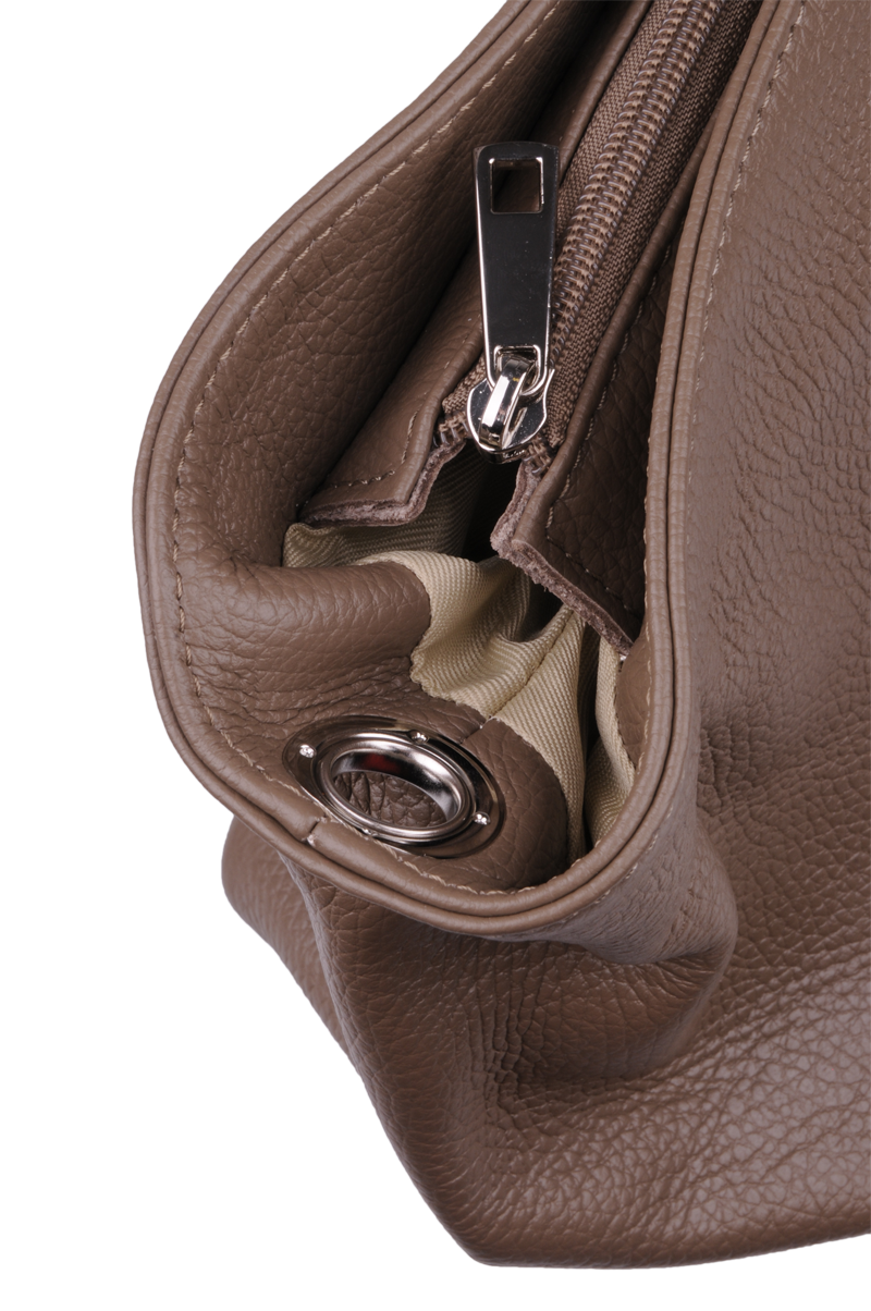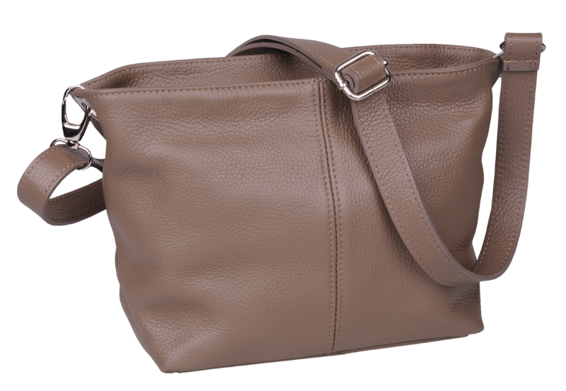 Hnědá kabelka nositelná přes rameno či cross-body (křížem). Tato kožená kabelka je uzavíratelná na zip. Uvnitř kabelky najdeme přepážku uprostřed, která zároveň slouží jako kapsa na zip, a na boční stěně pak kapsu na zip. Hloubka jejího dna je 13 cm. Kabelka má navíc nastavitelný popruh s maximální délkou cca 120 cm.