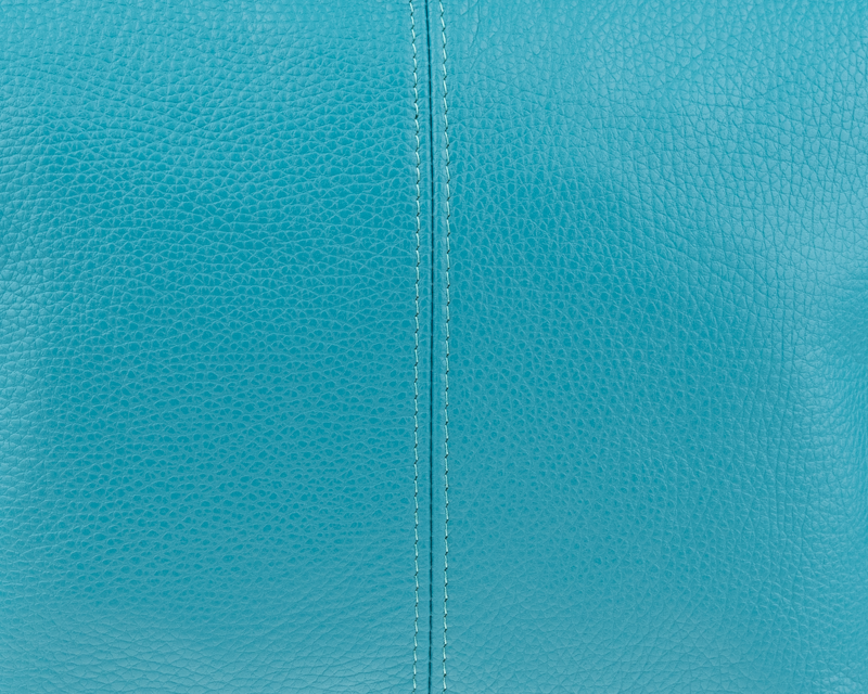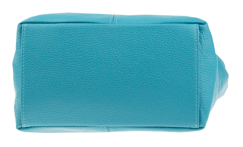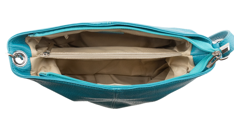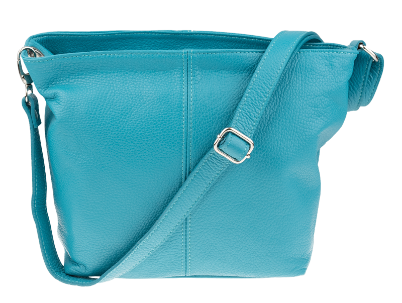Tyrkysová kabelka nositelná přes rameno či cross-body (křížem). Tato kožená kabelka je uzavíratelná na zip. Uvnitř kabelky najdeme přepážku uprostřed, která zároveň slouží jako kapsa na zip, a na boční stěně pak kapsu na zip. Hloubka jejího dna je 13 cm. Kabelka má navíc nastavitelný popruh s maximální délkou cca 120 cm.