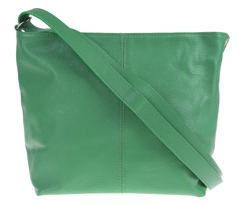 Zelená kabelka nositelná přes rameno či cross-body (křížem). Tato kožená kabelka je uzavíratelná na zip. Uvnitř kabelky najdeme přepážku uprostřed, která zároveň slouží jako kapsa na zip, a na boční stěně pak kapsu na zip. Hloubka jejího dna je 13 cm. Kabelka má navíc nastavitelný popruh s maximální délkou cca 120 cm.