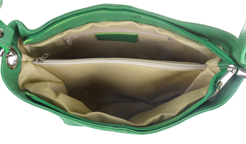 Zelená kabelka nositelná přes rameno či cross-body (křížem). Tato kožená kabelka je uzavíratelná na zip. Uvnitř kabelky najdeme přepážku uprostřed, která zároveň slouží jako kapsa na zip, a na boční stěně pak kapsu na zip. Hloubka jejího dna je 13 cm. Kabelka má navíc nastavitelný popruh s maximální délkou cca 120 cm.