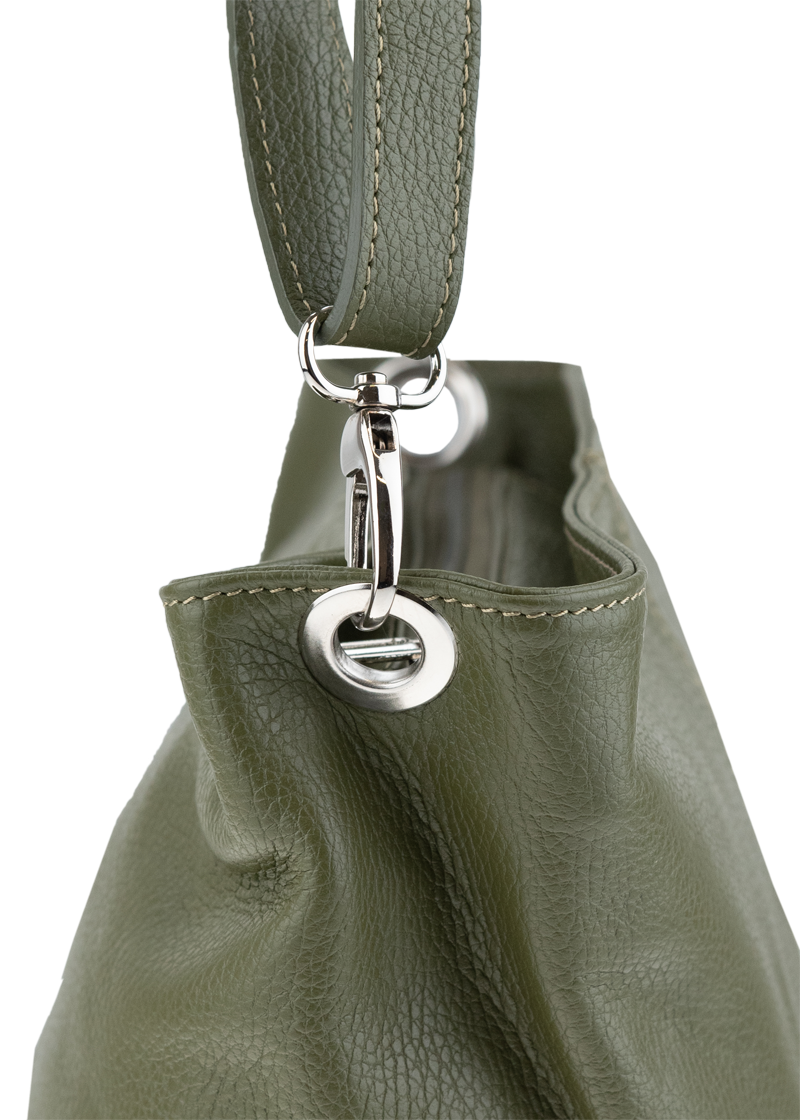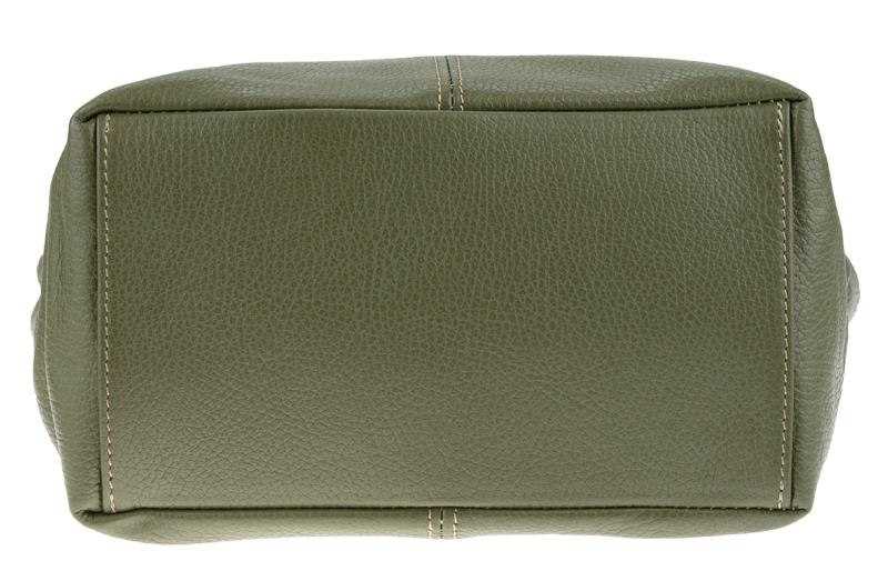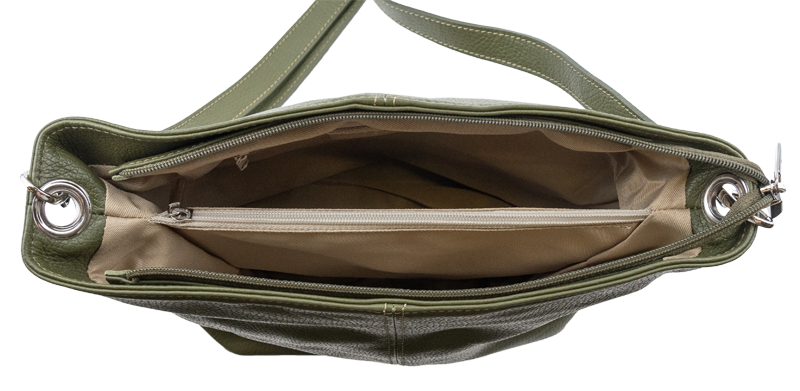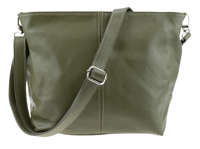 Zelená kabelka nositelná přes rameno či cross-body (křížem). Tato kožená kabelka je uzavíratelná na zip. Uvnitř kabelky najdeme přepážku uprostřed, která zároveň slouží jako kapsa na zip, a na boční stěně pak kapsu na zip. Hloubka jejího dna je 13 cm. Kabelka má navíc nastavitelný popruh s maximální délkou cca 120 cm.