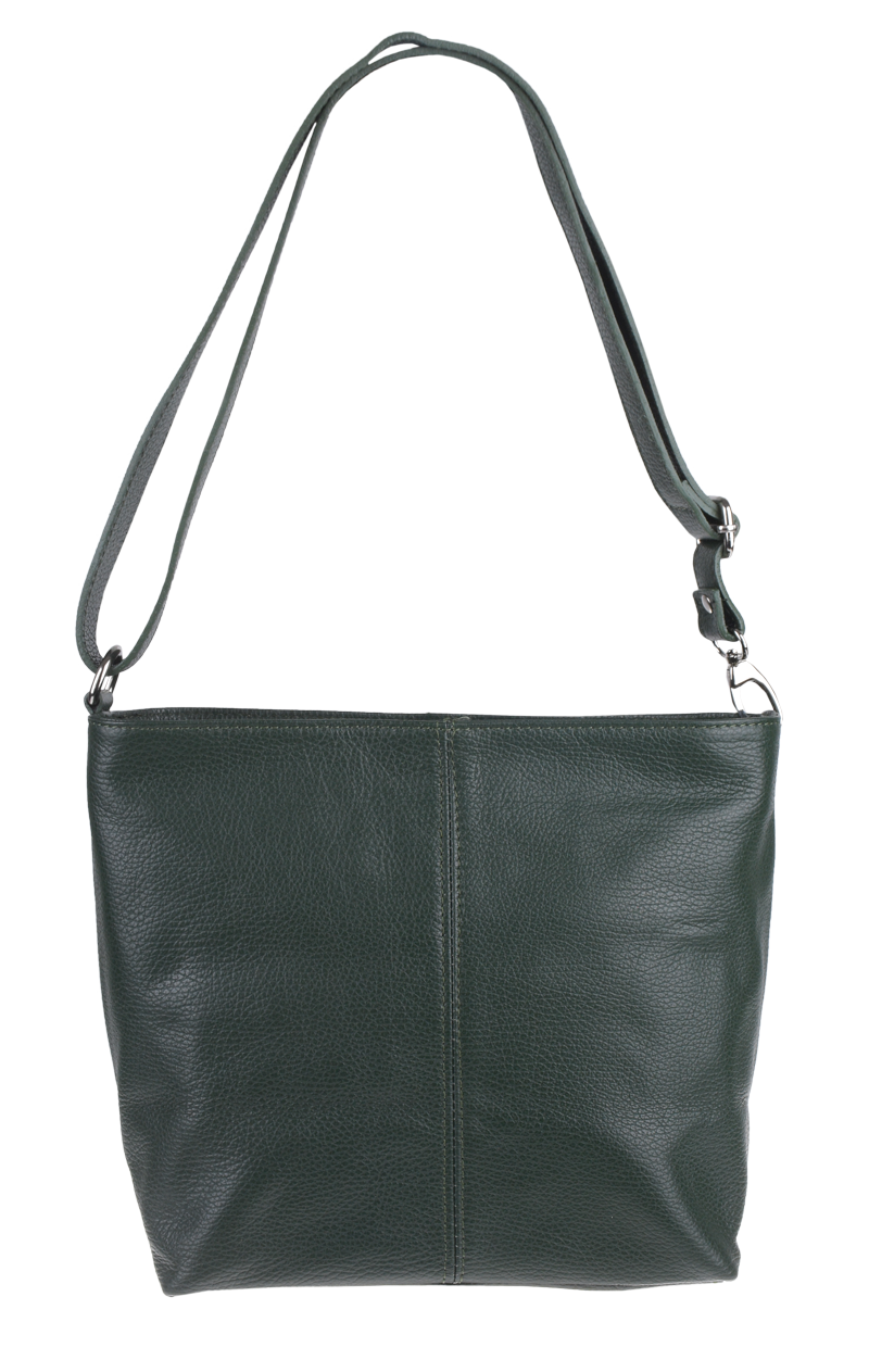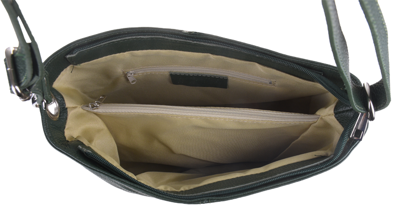 Zelená kabelka nositelná přes rameno či cross-body (křížem). Tato kožená kabelka je uzavíratelná na zip. Uvnitř kabelky najdeme přepážku uprostřed, která zároveň slouží jako kapsa na zip, a na boční stěně pak kapsu na zip. Hloubka jejího dna je 13 cm. Kabelka má navíc nastavitelný popruh s maximální délkou cca 120 cm.
