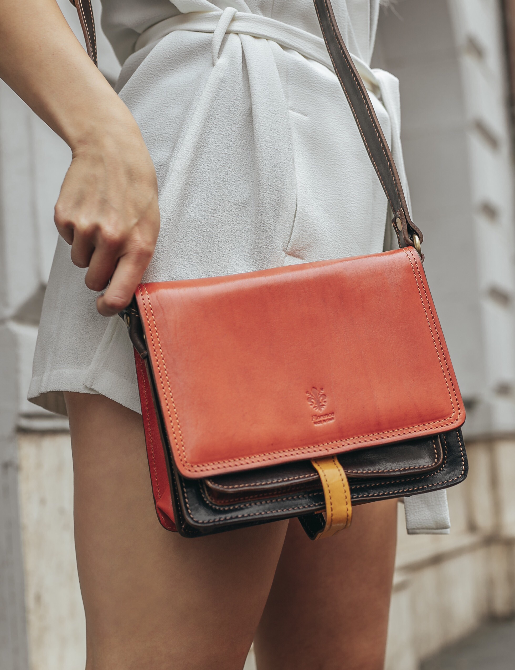 Kožená kabelka v hnědé barvě. Kabelka se uzavírá pomocí poklopu na patentky. Uvnitř kabelky jsou tři přihrádky. Délka popruhu je 130 cm. Další barevné varianty kabelky Quieta naleznete zde.