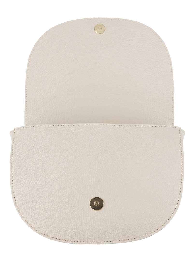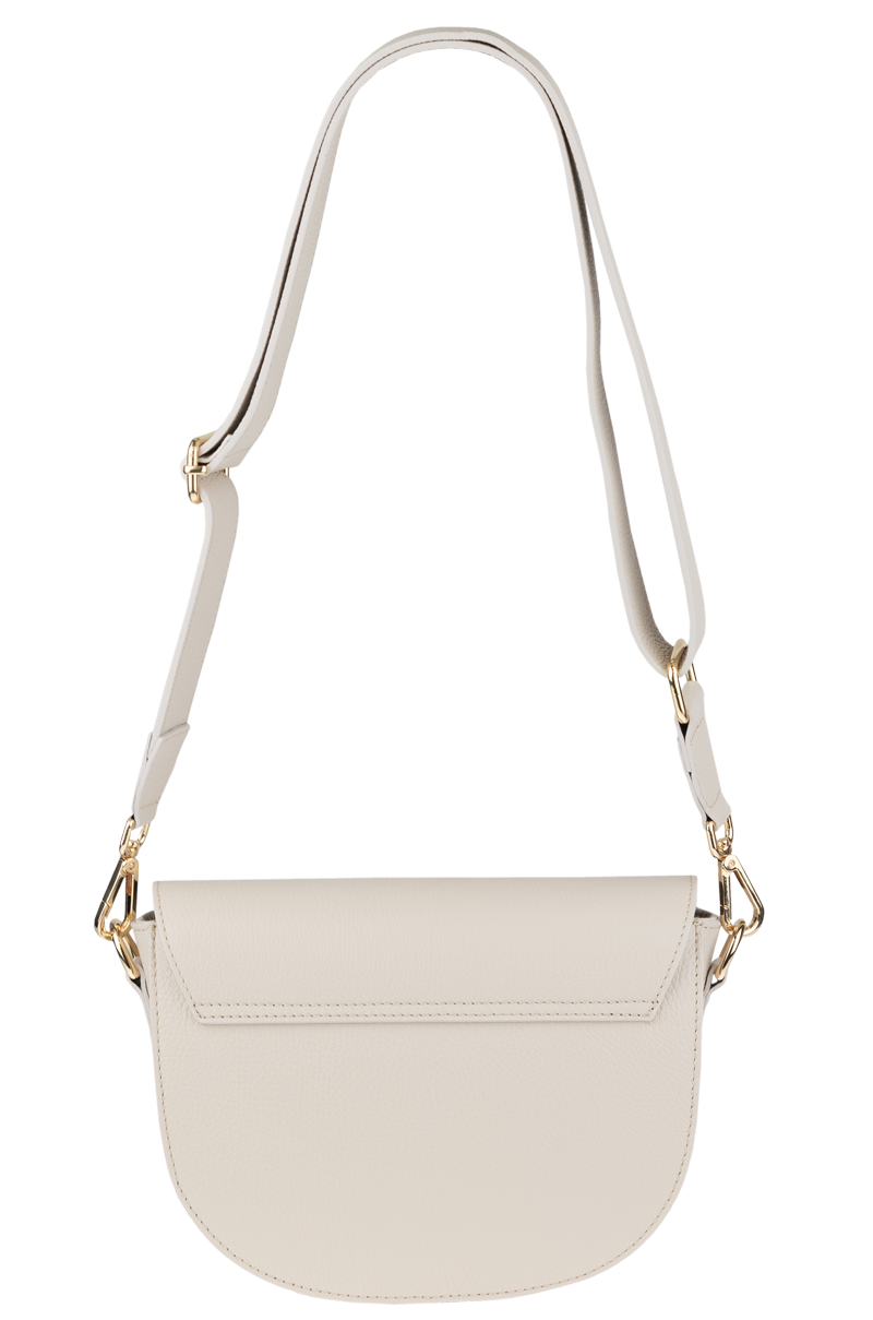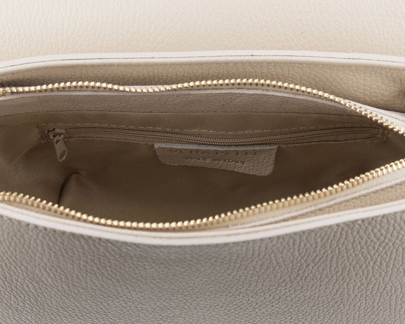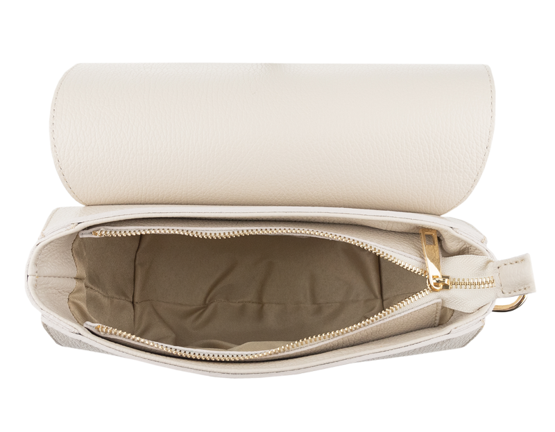 Béžová kabelka nositelná přes rameno či cross-body (křížem). Tato kožená kabelka je uzavíratelná na patentku a uvnitř nalezneme přihrádku na zip. Kabelka má nastavitelný popruh s maximální délkou cca 140cm.