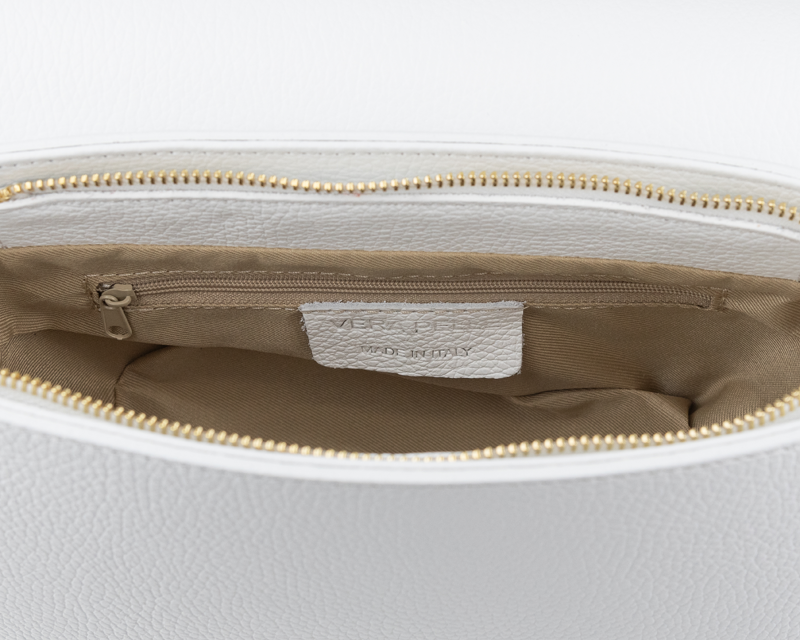 Bílá kabelka nositelná přes rameno či cross-body (křížem). Tato kožená kabelka je uzavíratelná na patentku a uvnitř nalezneme přihrádku na zip.