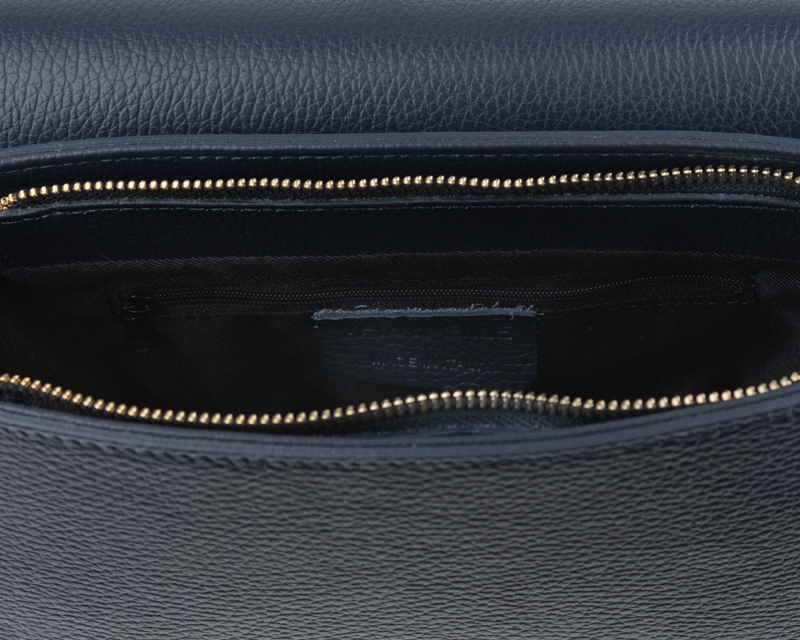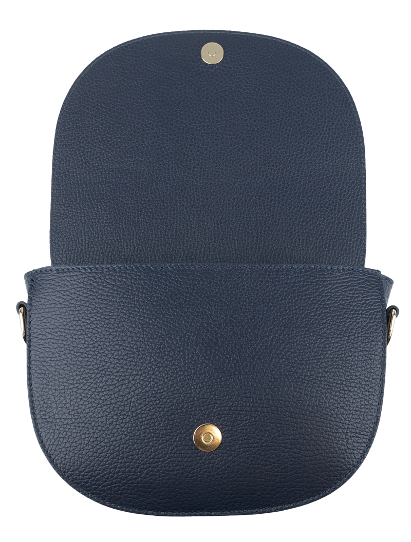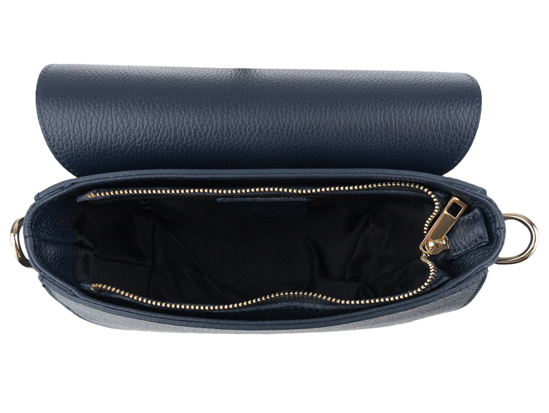 Modrá kabelka nositelná přes rameno či cross-body (křížem). Tato kožená kabelka je uzavíratelná na patentku a uvnitř nalezneme přihrádku na zip.