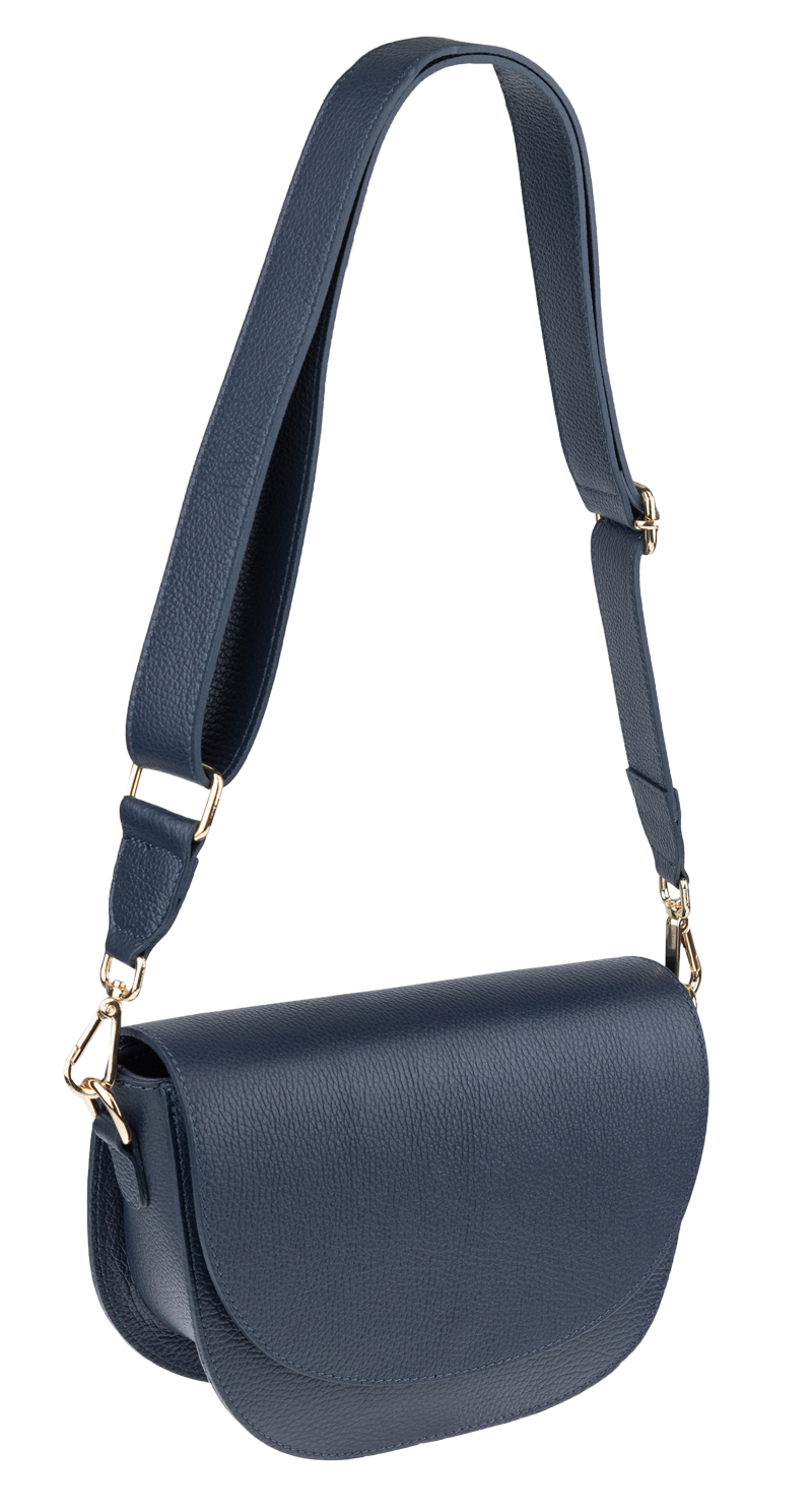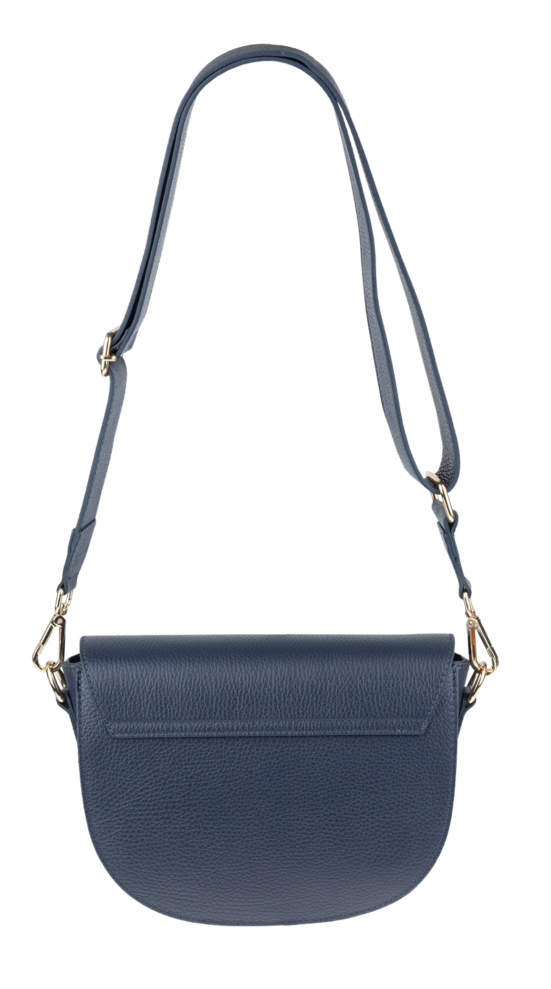 Modrá kabelka nositelná přes rameno či cross-body (křížem). Tato kožená kabelka je uzavíratelná na patentku a uvnitř nalezneme přihrádku na zip. Kabelka má nastavitelný popruh s maximální délkou cca 140cm.