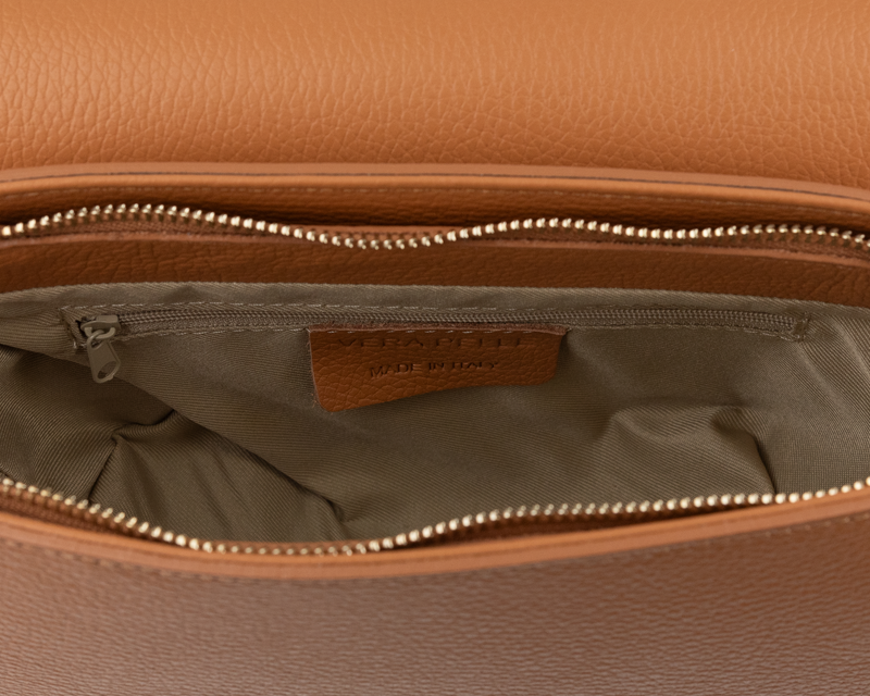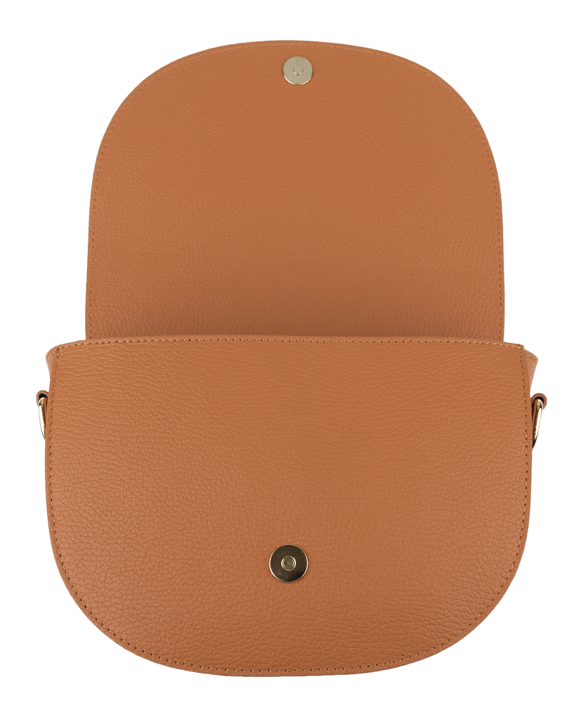 Camel kabelka nositelná přes rameno či cross-body (křížem). Tato kožená kabelka je uzavíratelná na patentku a uvnitř nalezneme přihrádku na zip.