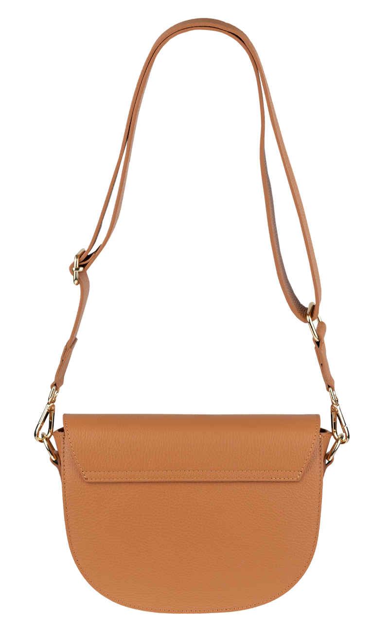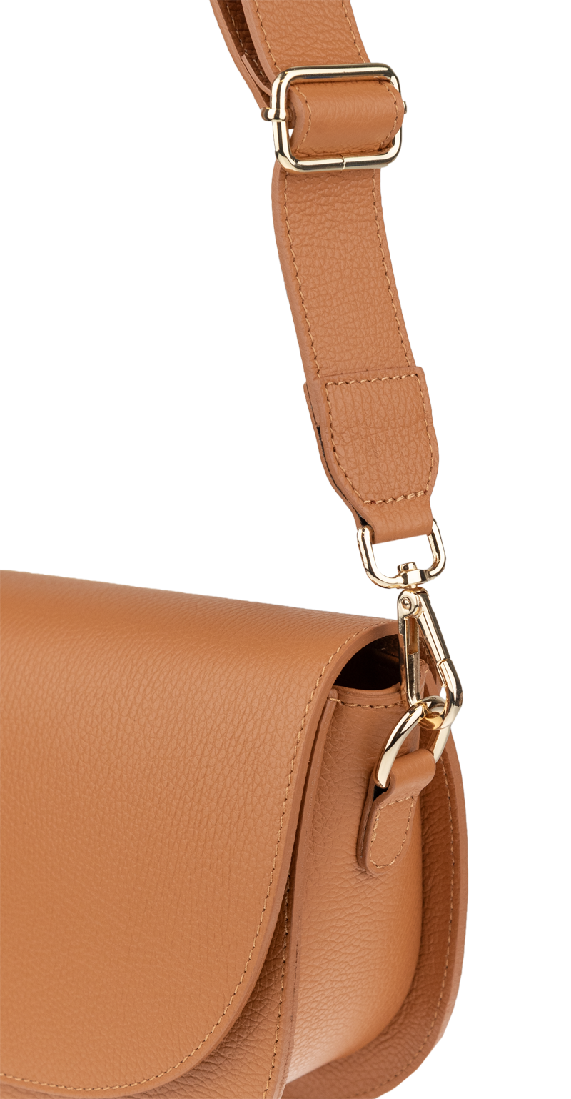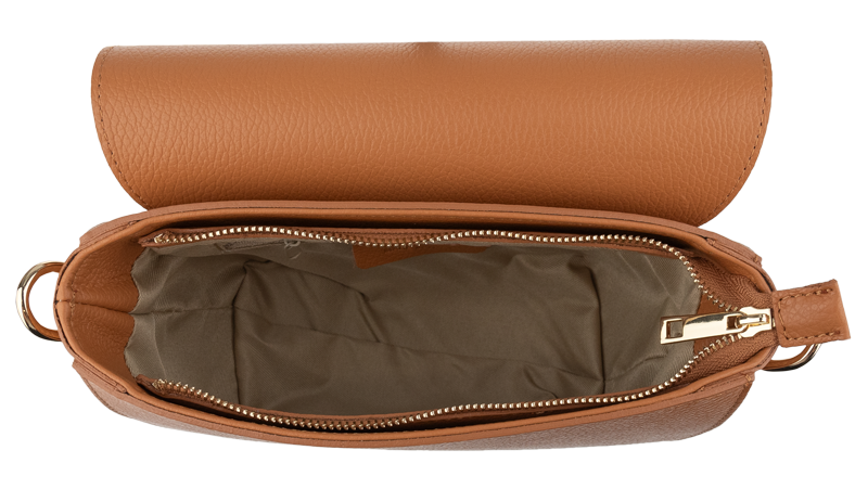 Camel kabelka nositelná přes rameno či cross-body (křížem). Tato kožená kabelka je uzavíratelná na patentku a uvnitř nalezneme přihrádku na zip. Kabelka má nastavitelný popruh s maximální délkou cca 140cm.