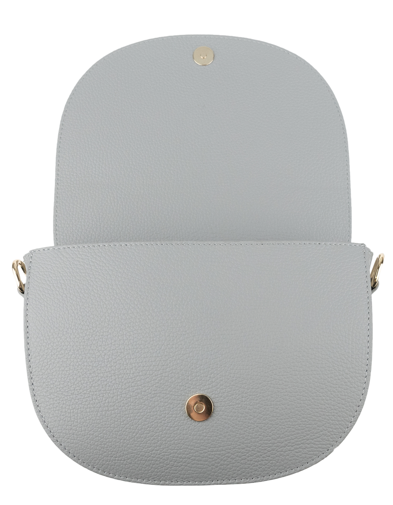 Šedá kabelka nositelná přes rameno či cross-body (křížem). Tato kožená kabelka je uzavíratelná na patentku a uvnitř nalezneme přihrádku na zip.