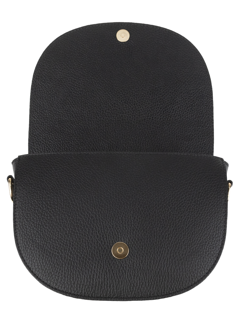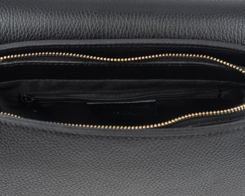 Černá kabelka nositelná přes rameno či cross-body (křížem). Tato kožená kabelka je uzavíratelná na patentku a uvnitř nalezneme přihrádku na zip.