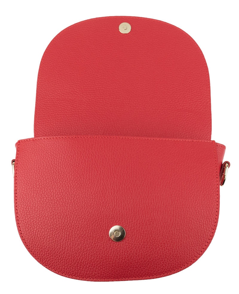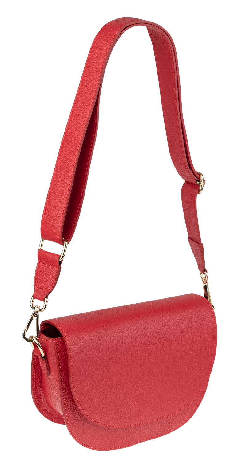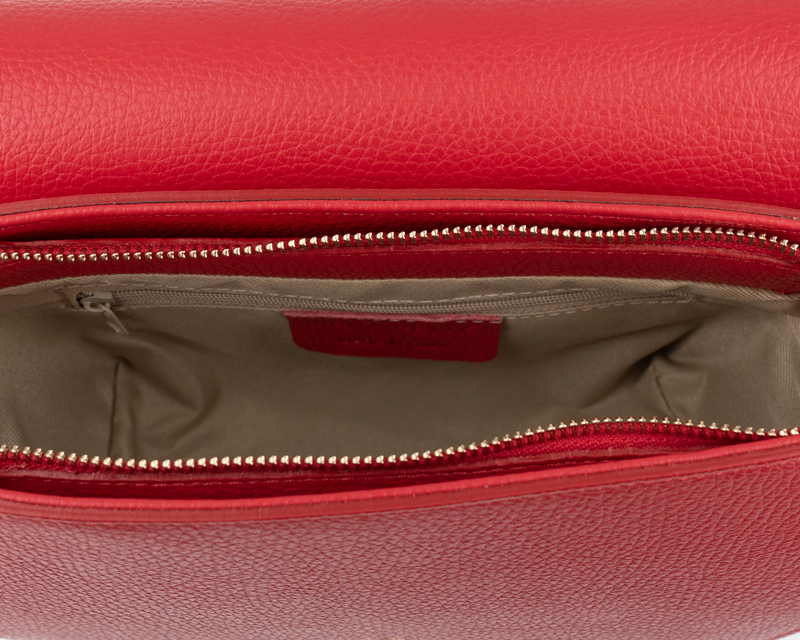 Červená kabelka nositelná přes rameno či cross-body (křížem). Tato kožená kabelka je uzavíratelná na patentku a uvnitř nalezneme přihrádku na zip. Kabelka má nastavitelný popruh s maximální délkou cca 140cm.