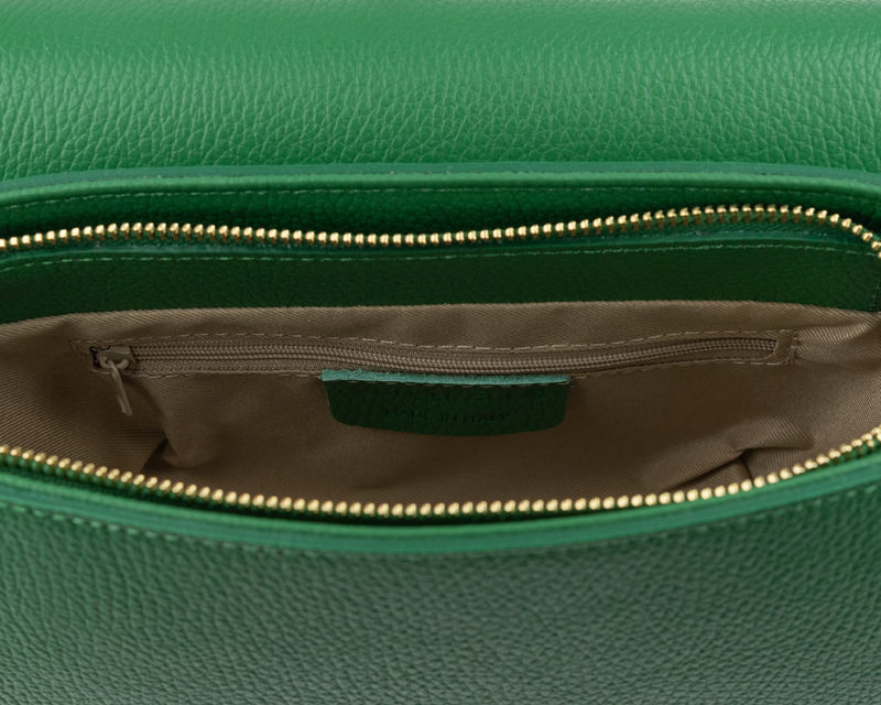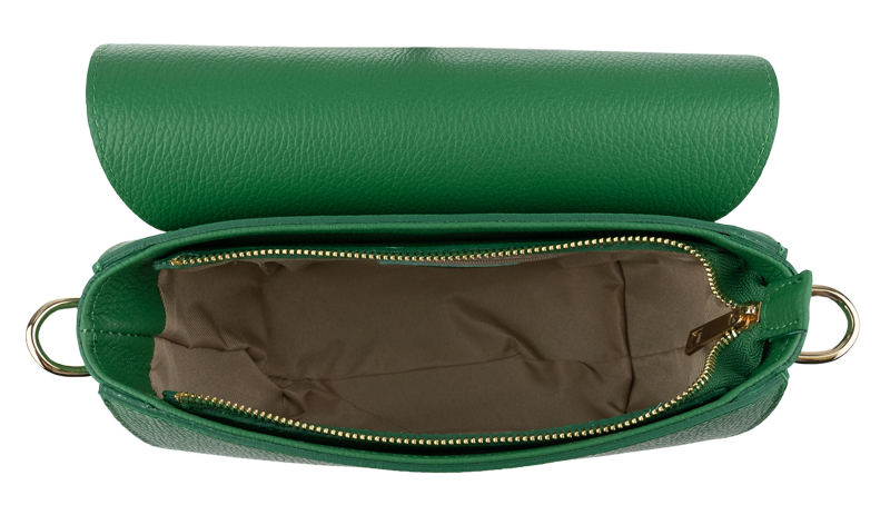 Zelená kabelka nositelná přes rameno či cross-body (křížem). Tato kožená kabelka je uzavíratelná na patentku a uvnitř nalezneme přihrádku na zip.