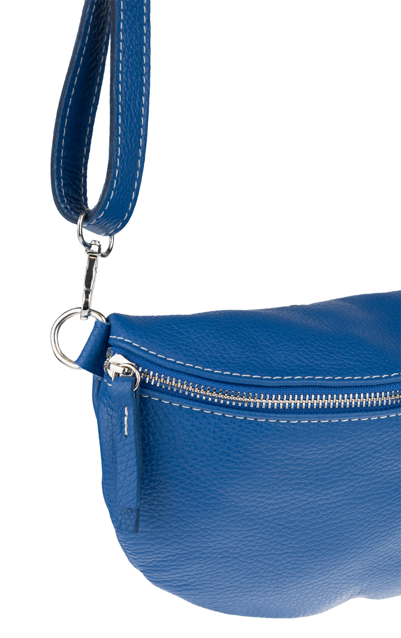 Elegantní, ale zároveň velmi praktická modrá ledvinka malých rozměrů vyrobena z pravé kůže.