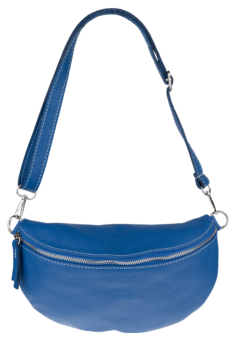 Elegantní, ale zároveň velmi praktická modrá ledvinka malých rozměrů vyrobena z pravé kůže.