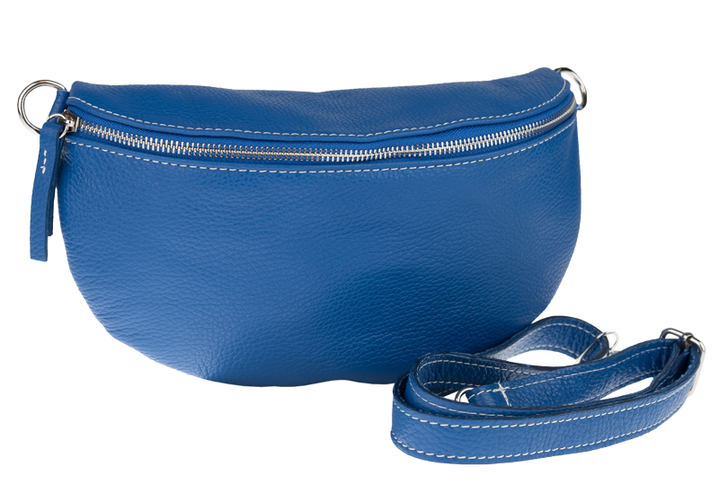 Elegantní, ale zároveň velmi praktická modrá ledvinka malých rozměrů vyrobena z pravé kůže.