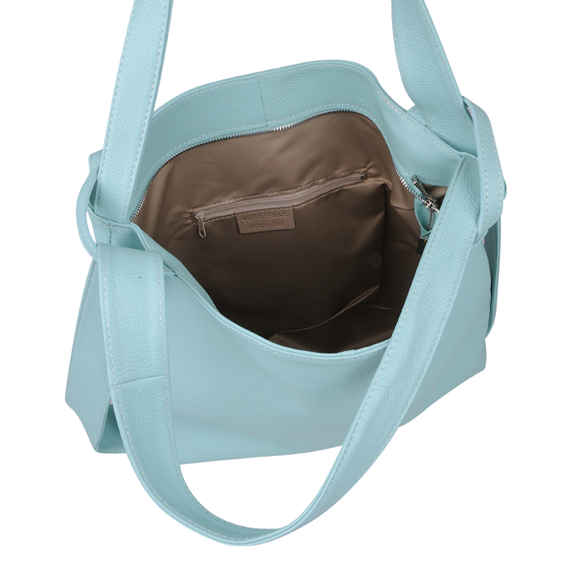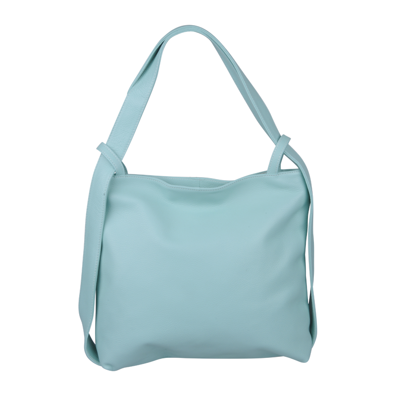 Krásná kožená kabelka s jednoduchým designem v tyrkysové barvě. Tato kožená kabelka je uzavíratelná pomocí zipu. Disponuje pohodlnými uchy dostatečné délky, takže jí lze nosit pohodlně přes rameno nebo jako batůžek. Pohodlně se do ní vejdou dokumenty formátu A4.