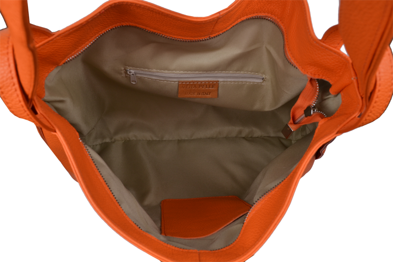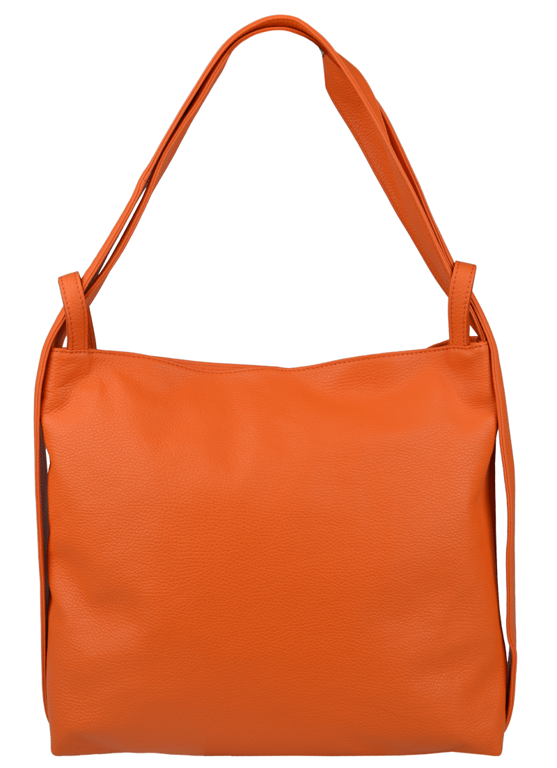 Krásná kožená kabelka s jednoduchým designem v oranžové barvě. Tato kožená kabelka je uzavíratelná pomocí zipu. Disponuje pohodlnými uchy dostatečné délky, takže jí lze nosit pohodlně přes rameno nebo jako batůžek. Pohodlně se do ní vejdou dokumenty formátu A4.