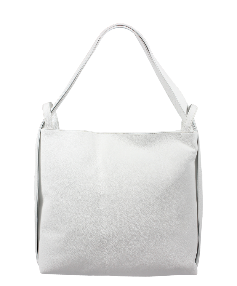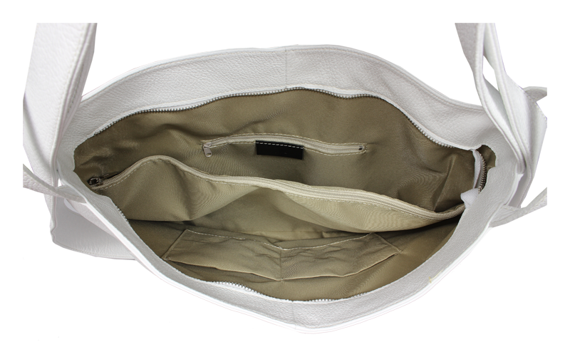 Krásná kožená kabelka s jednoduchým designem v bílé barvě. Tato kožená kabelka je uzavíratelná pomocí zipu. Disponuje pohodlnými uchy dostatečné délky, takže jí lze nosit pohodlně přes rameno nebo jako batůžek. Pohodlně se do ní vejdou dokumenty formátu A4.