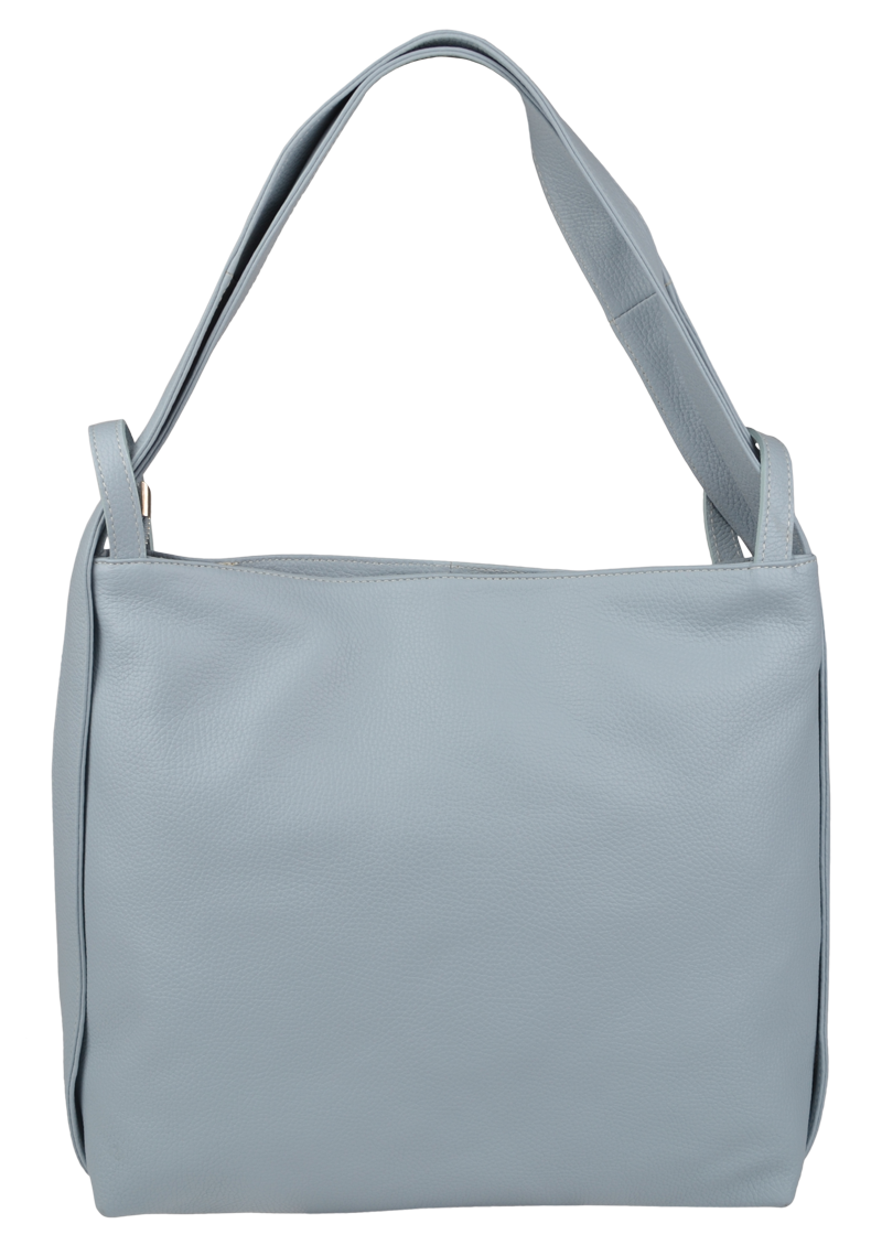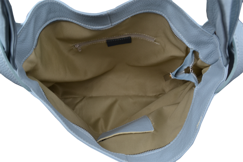 Krásná kožená kabelka s jednoduchým designem v modré barvě. Tato kožená kabelka je uzavíratelná pomocí zipu. Disponuje pohodlnými uchy dostatečné délky, takže jí lze nosit pohodlně přes rameno nebo jako batůžek. Pohodlně se do ní vejdou dokumenty formátu A4.