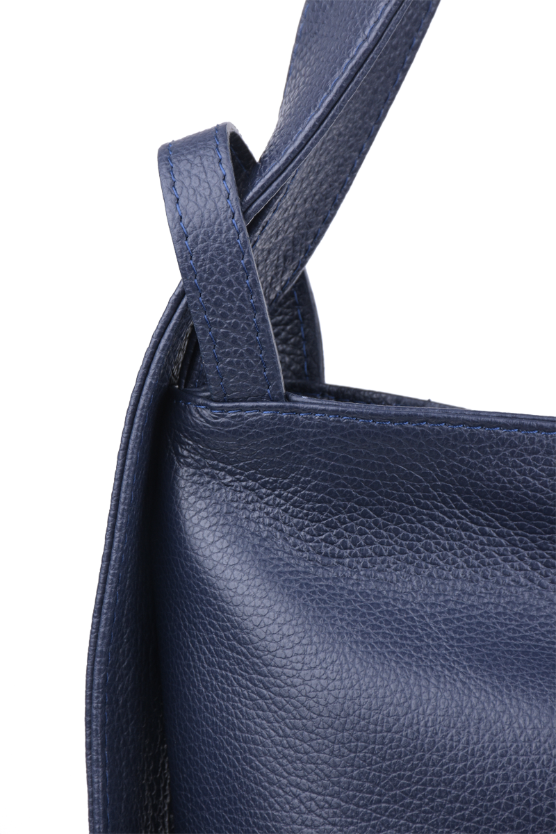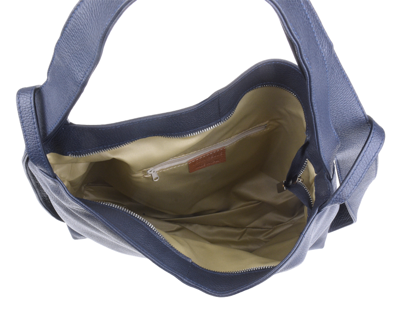 Krásná kožená kabelka s jednoduchým designem v modré barvě. Tato kožená kabelka je uzavíratelná pomocí zipu. Disponuje pohodlnými uchy dostatečné délky, takže jí lze nosit  pohodlně přes rameno nebo jako batůžek.  Pohodlně se do ní vejdou dokumenty formátu A4.