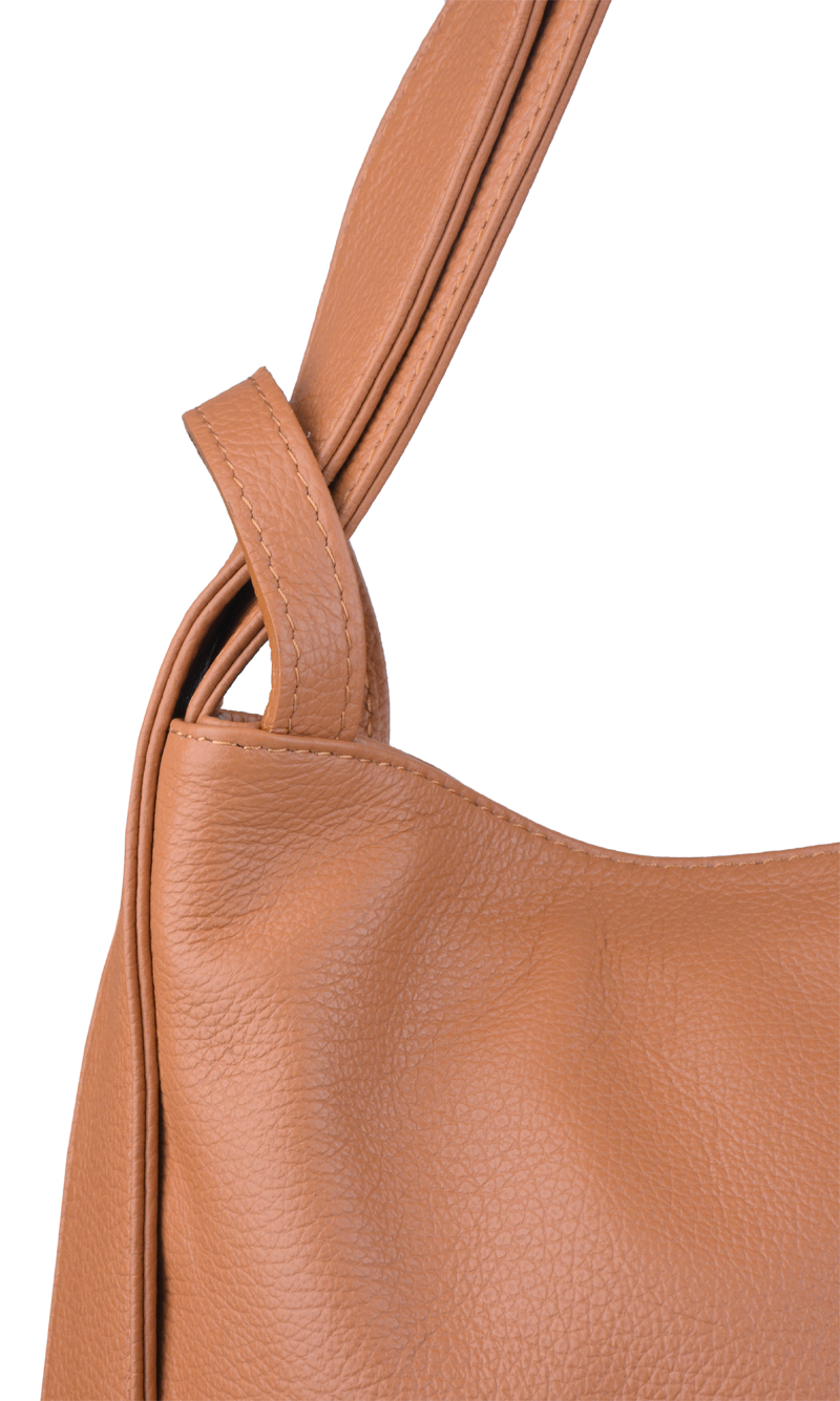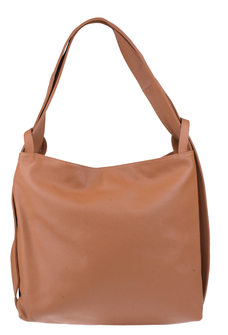 Krásná kožená kabelka s jednoduchým designem v camel barvě. Tato kožená kabelka je uzavíratelná pomocí zipu. Disponuje pohodlnými uchy dostatečné délky, takže jí lze nosit  pohodlně přes rameno nebo jako batůžek. Pohodlně se do ní vejdou dokumenty formátu A4.