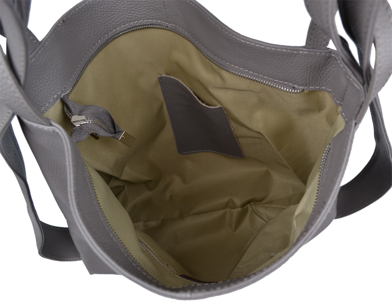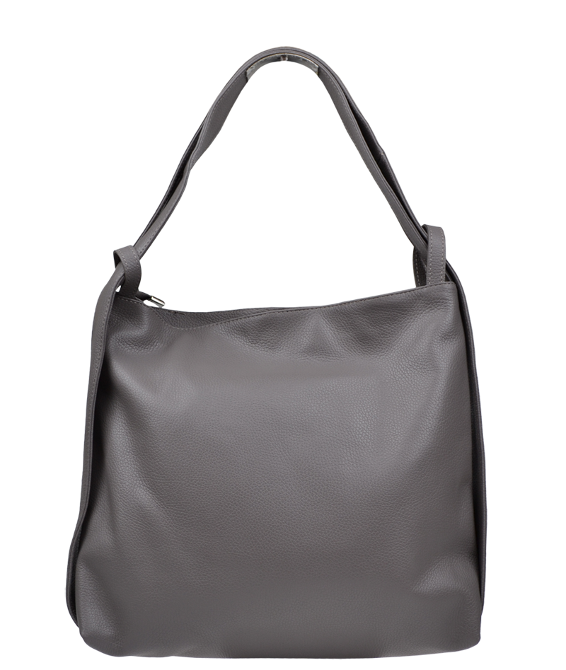 Krásná kožená kabelka s jednoduchým designem v šedé barvě. Tato kožená kabelka je uzavíratelná pomocí zipu. Disponuje pohodlnými uchy dostatečné délky, takže jí lze nosit pohodlně přes rameno nebo jako batůžek. Pohodlně se do ní vejdou dokumenty formátu A4.