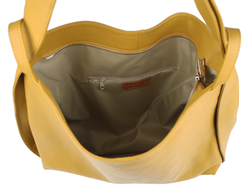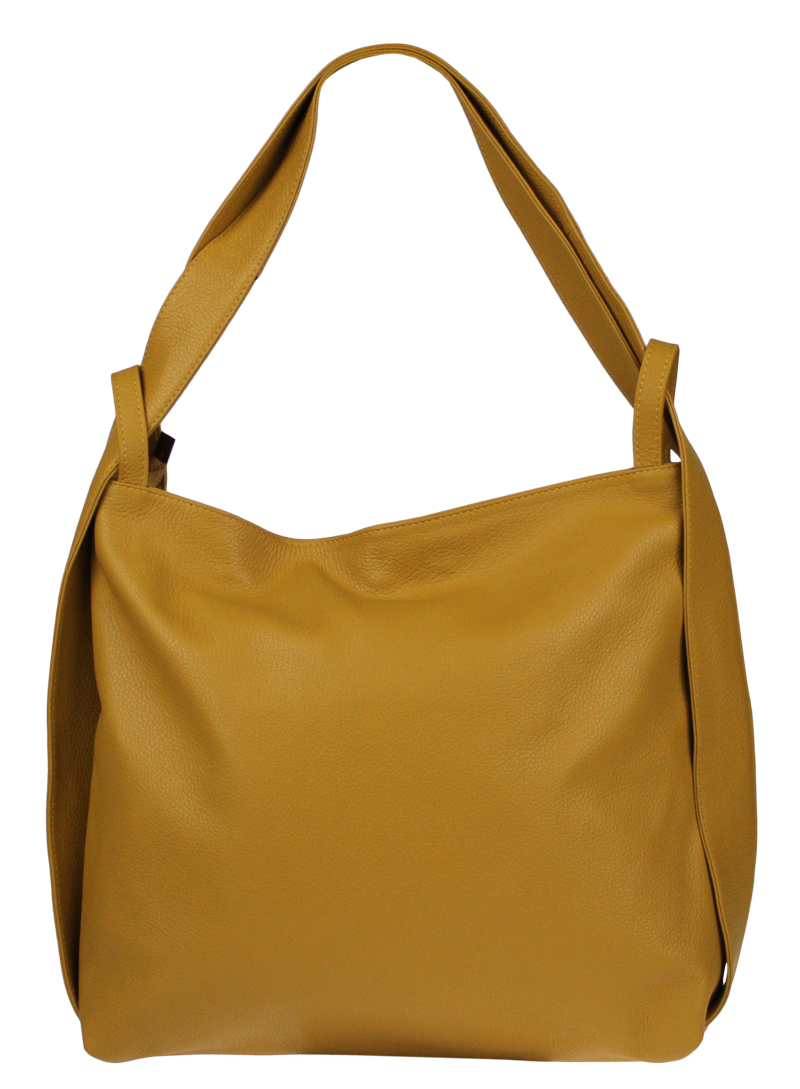 Krásná kožená kabelka s jednoduchým designem ve žluté barvě. Tato kožená kabelka je uzavíratelná pomocí zipu. Disponuje pohodlnými uchy dostatečné délky, takže jí lze nosit pohodlně přes rameno nebo jako batůžek. Pohodlně se do ní vejdou dokumenty formátu A4.