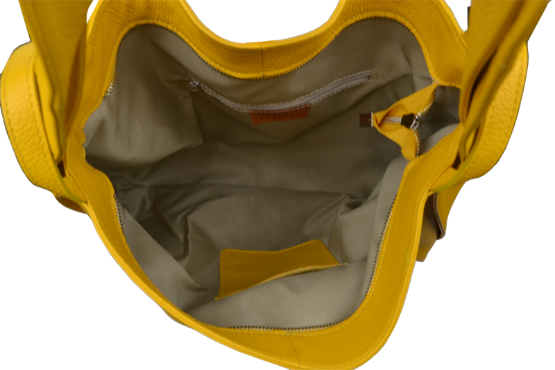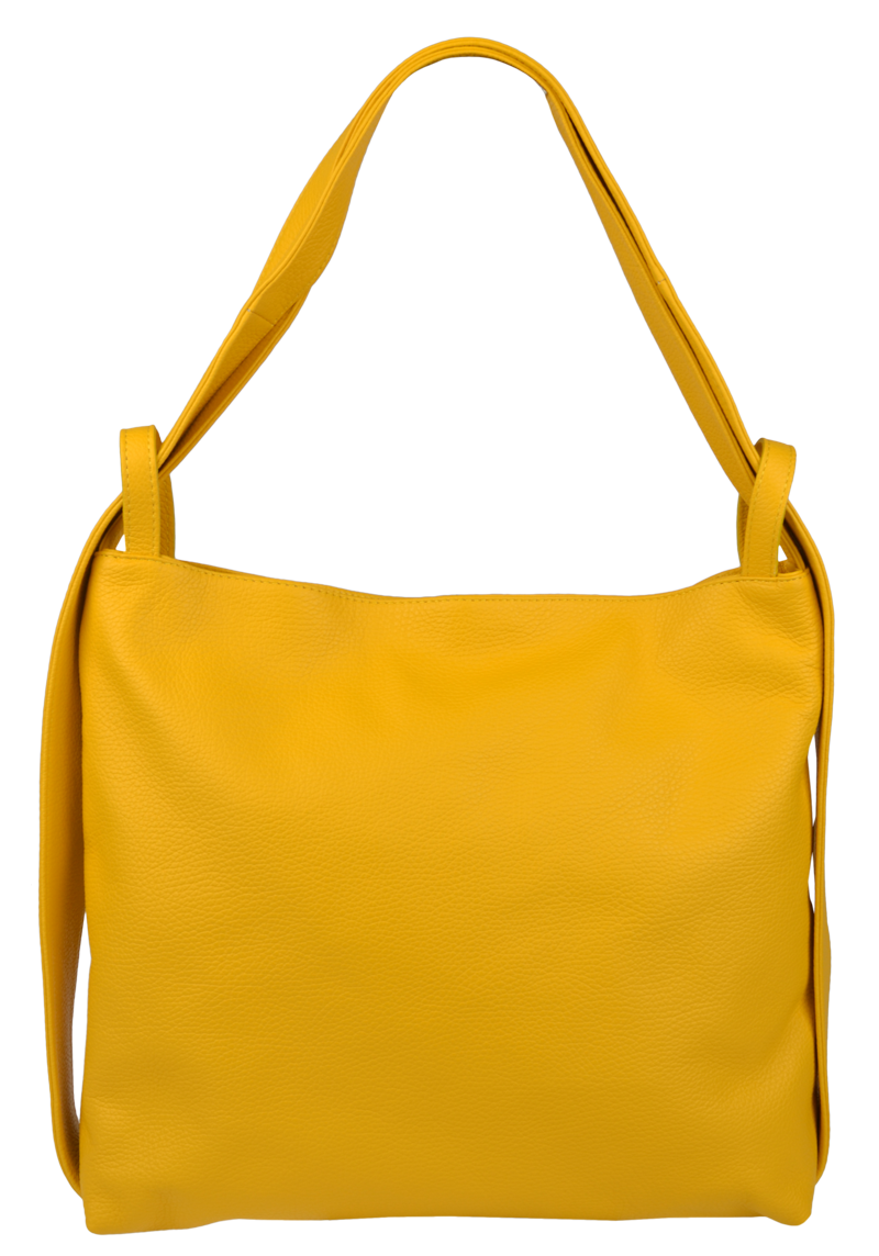 Krásná kožená kabelka s jednoduchým designem ve žluté barvě. Tato kožená kabelka je uzavíratelná pomocí zipu. Disponuje pohodlnými uchy dostatečné délky, takže jí lze nosit pohodlně přes rameno nebo jako batůžek. Pohodlně se do ní vejdou dokumenty formátu A4.