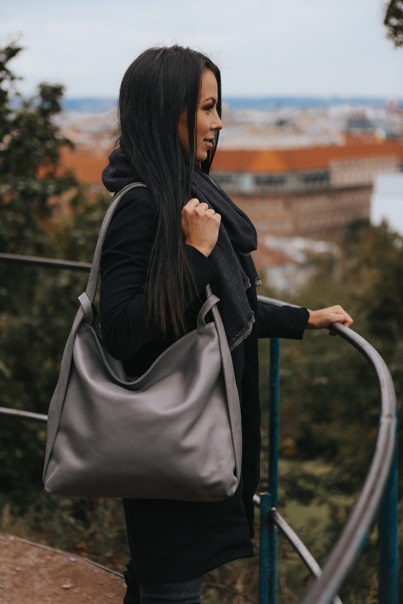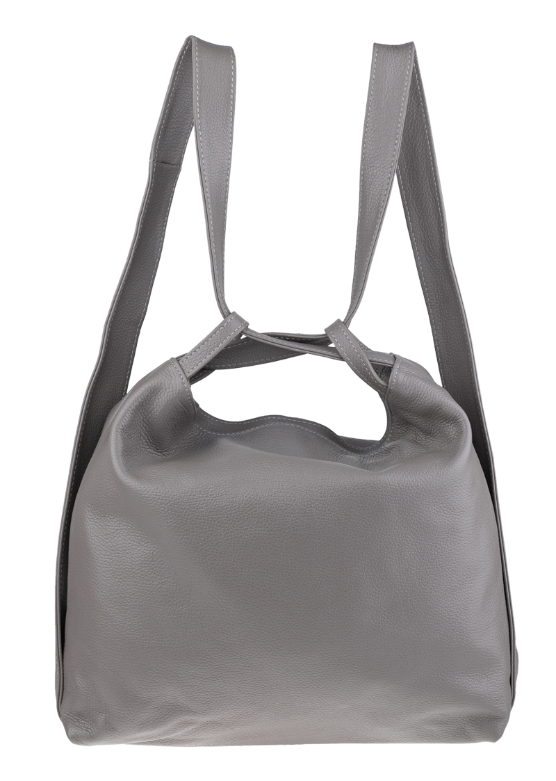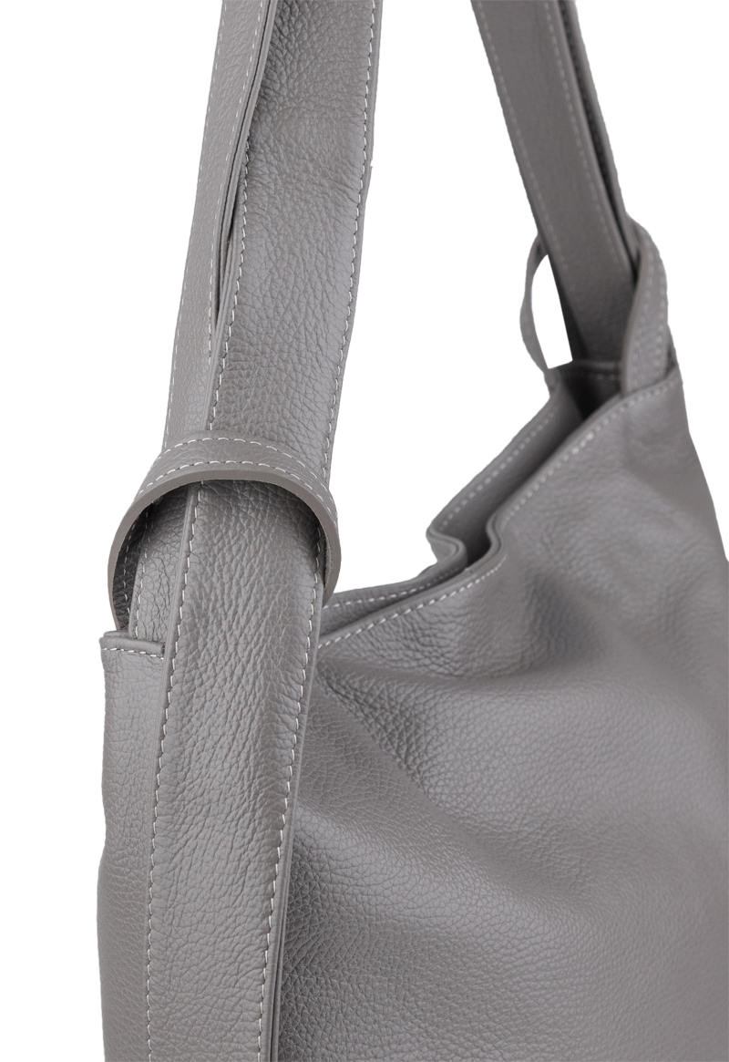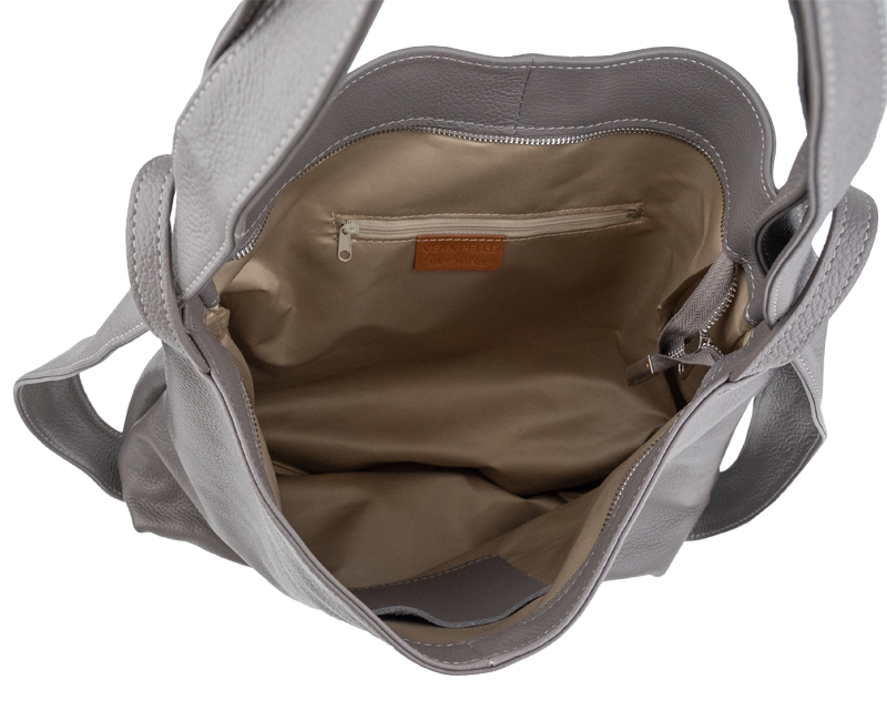 Krásná kožená kabelka s jednoduchým designem v šedé barvě. Tato kožená kabelka je uzavíratelná pomocí zipu. Disponuje pohodlnými uchy dostatečné délky, takže jí lze nosit pohodlně přes rameno nebo jako batůžek. Pohodlně se do ní vejdou dokumenty formátu A4.