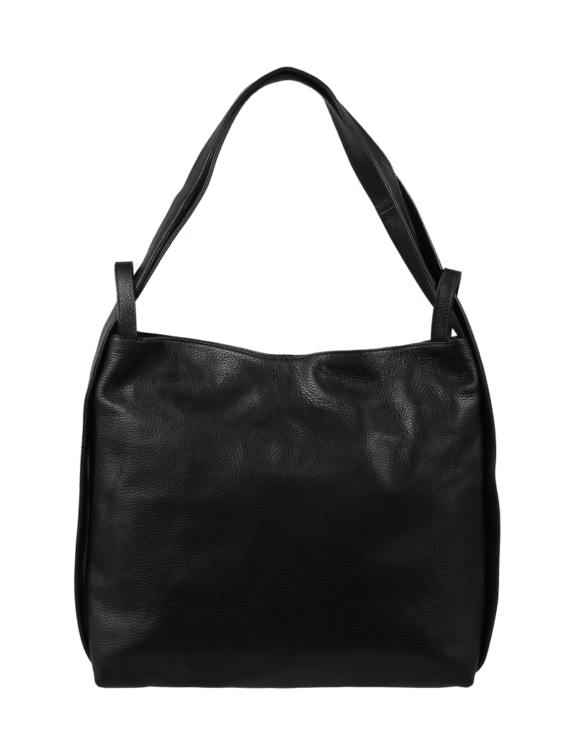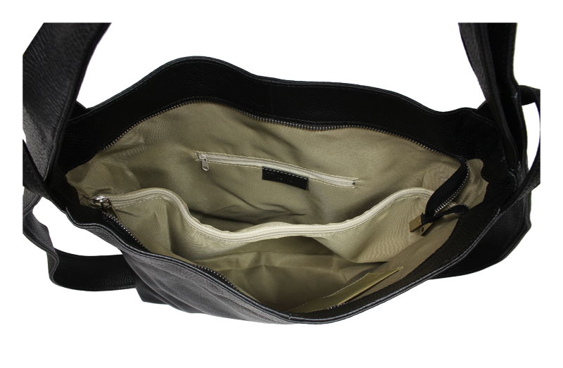 Krásná kožená kabelka s jednoduchým designem v černé barvě. Tato kožená kabelka je uzavíratelná pomocí zipu. Disponuje pohodlnými uchy dostatečné délky, takže jí lze nosit pohodlně přes rameno nebo jako batůžek.Pohodlně se do ní vejdou dokumenty formátu A4.
