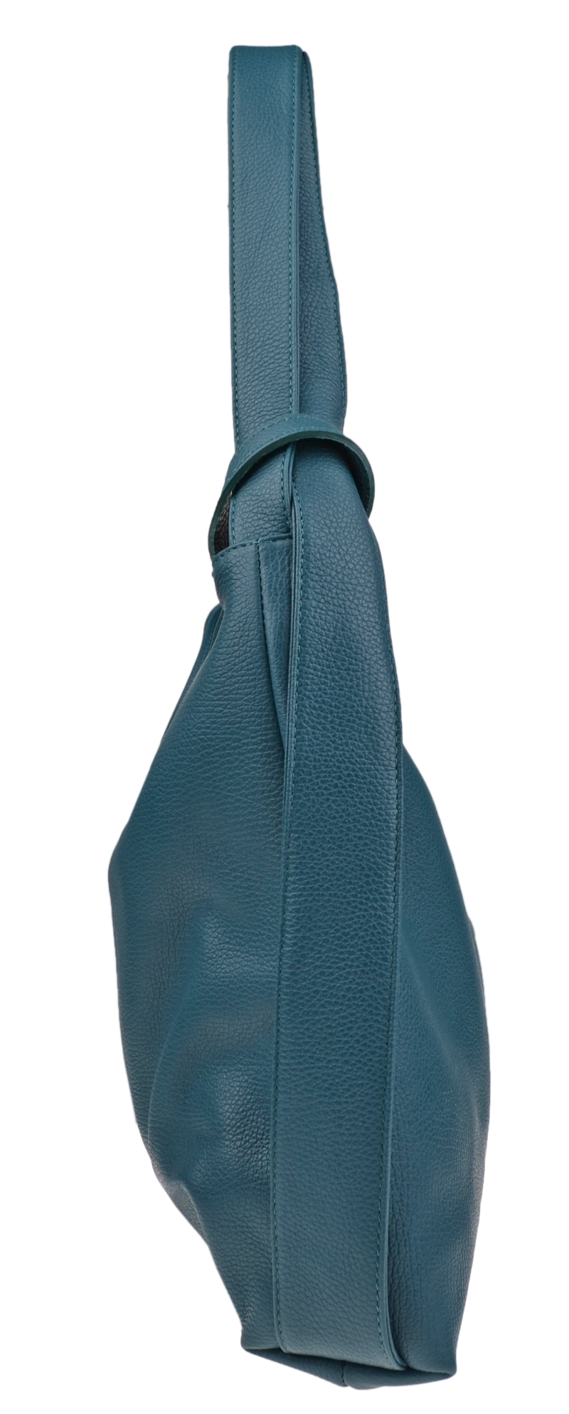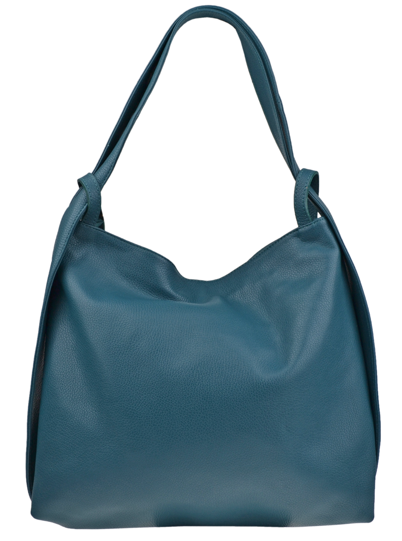 Krásná kožená kabelka s jednoduchým designem v modro-zelené barvě. Tato kožená kabelka je uzavíratelná pomocí zipu. Disponuje pohodlnými uchy dostatečné délky, takže jí lze nosit pohodlně přes rameno nebo jako batůžek. Pohodlně se do ní vejdou dokumenty formátu A4.
