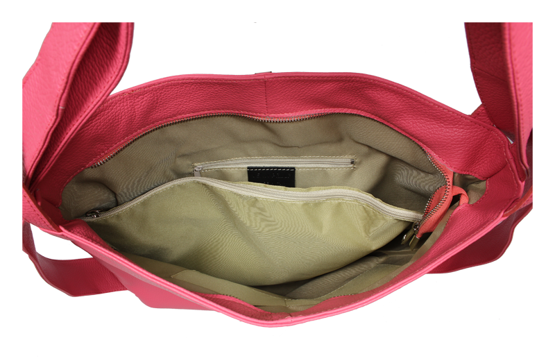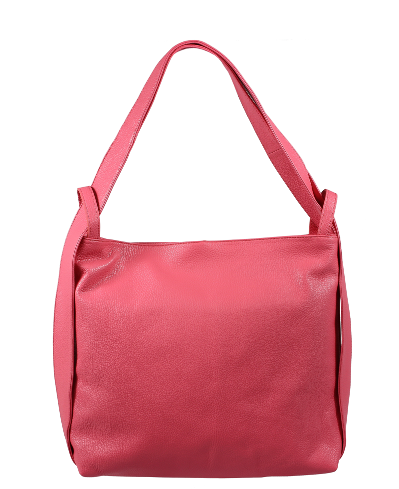 Krásná kožená kabelka s jednoduchým designem v růžové barvě. Tato kožená kabelka je uzavíratelná pomocí zipu. Disponuje pohodlnými uchy dostatečné délky, takže jí lze nosit pohodlně přes rameno nebo jako batůžek. Pohodlně se do ní vejdou dokumenty formátu A4.