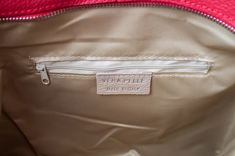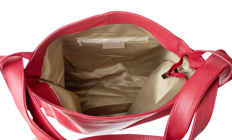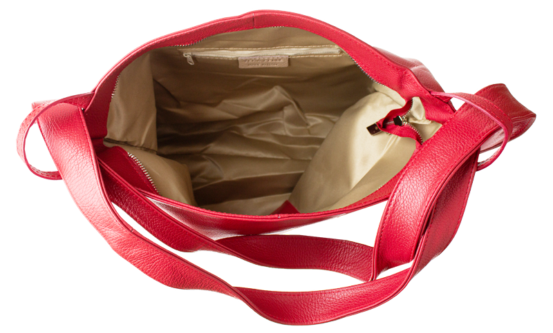 Krásná kožená kabelka s jednoduchým designem v červené barvě. Tato kožená kabelka je uzavíratelná pomocí zipu. Disponuje pohodlnými uchy dostatečné délky, takže jí lze nosit pohodlně přes rameno nebo jako batůžek. Pohodlně se do ní vejdou dokumenty formátu A4.