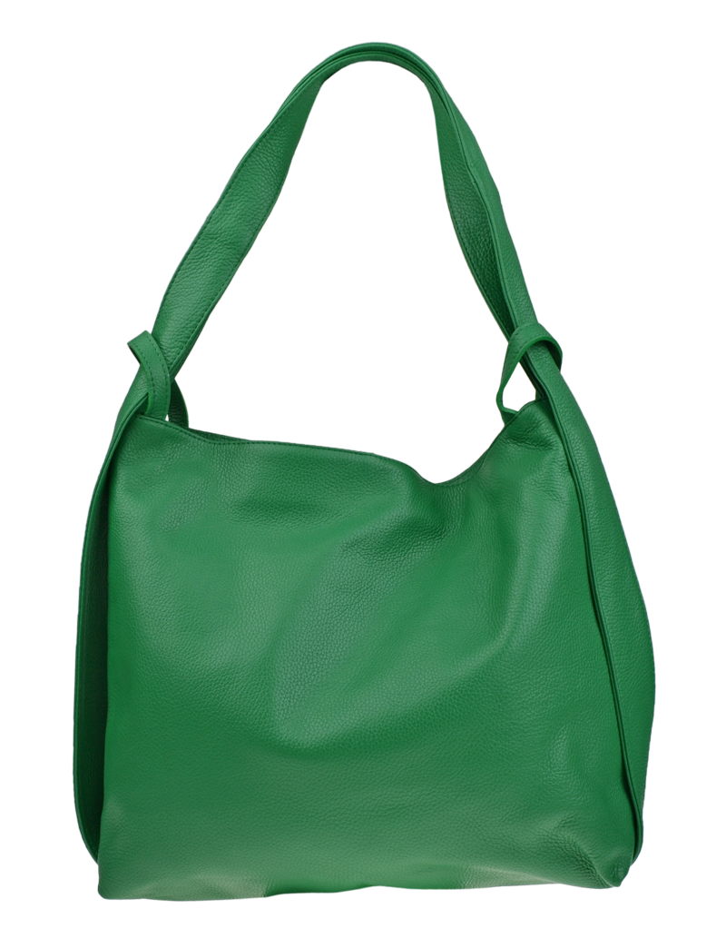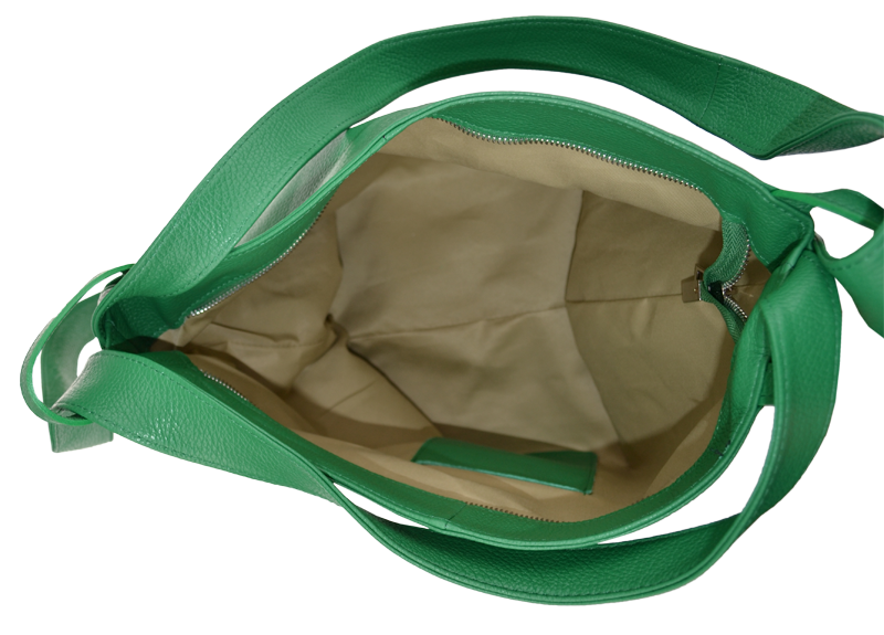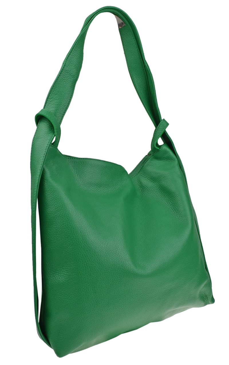 Krásná kožená kabelka s jednoduchým designem v zelené barvě. Tato kožená kabelka je uzavíratelná pomocí zipu. Disponuje pohodlnými uchy dostatečné délky, takže jí lze nosit pohodlně přes rameno nebo jako batůžek. Pohodlně se do ní vejdou dokumenty formátu A4.