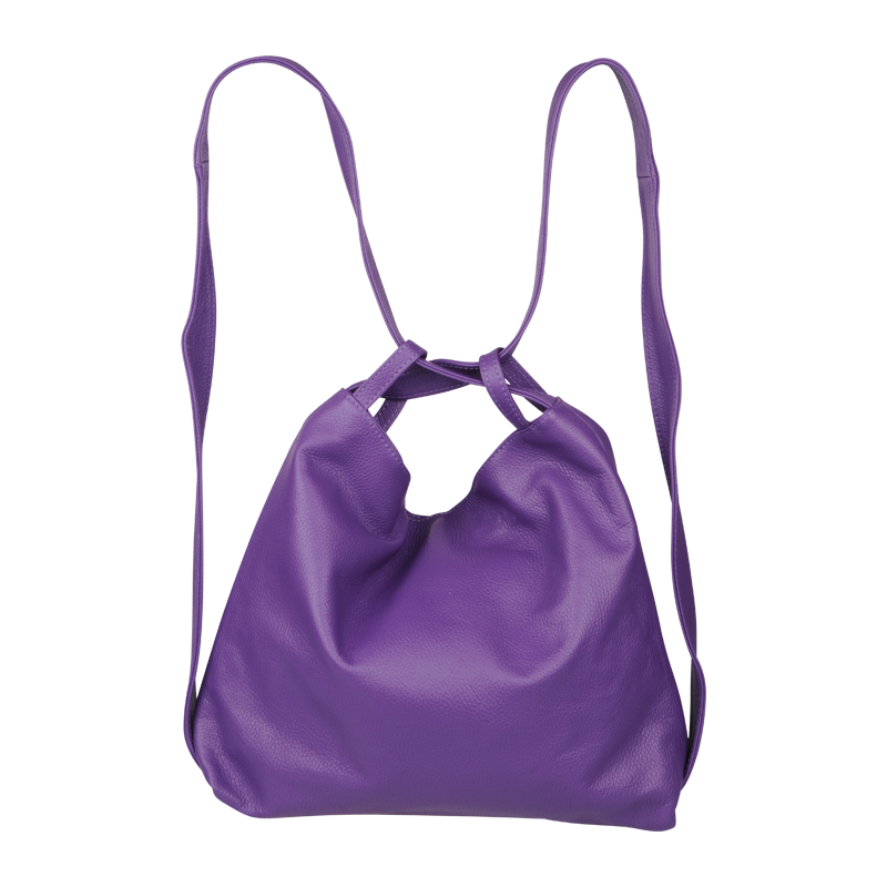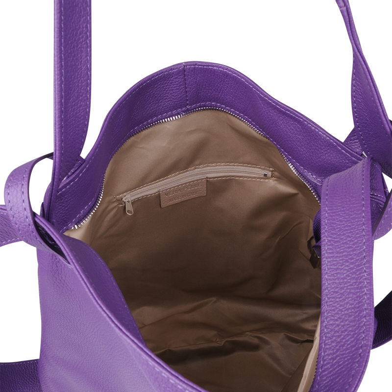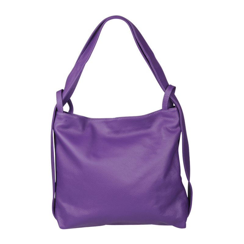 Krásná kožená kabelka s jednoduchým designem ve fialové barvě. Tato kožená kabelka je uzavíratelná pomocí zipu. Disponuje pohodlnými uchy dostatečné délky, takže jí lze nosit pohodlně přes rameno nebo jako batůžek. Pohodlně se do ní vejdou dokumenty formátu A4.