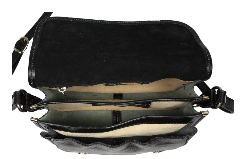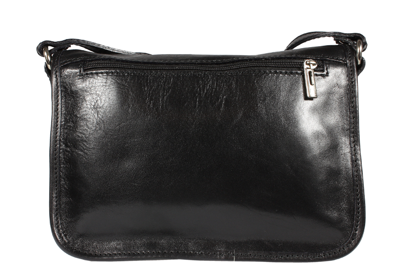 Kožená kabelka v černé barvě. Kabelka se uzavírá pomocí poklopu na patentky. Uvnitř kabelky jsou tři přihrádky a zavírací kapsa na zip.