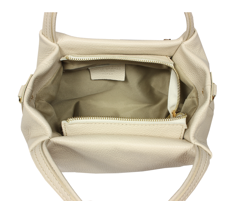 Elegantní a praktická béžová kabelka nositelná cross-body (křížem) nebo v ruce. Tato kožená kabelka je uzavíratelná na zip. Uvnitř kabelky najdeme na boční stěně kapsu na zip a přihrádky pro mobil či klíče. Hloubka jejího dna je 13 cm. Kabelka má navíc nastavitelný popruh s maximální délkou cca 120 cm.