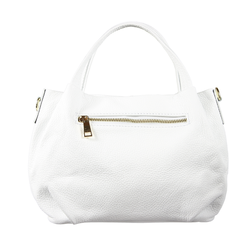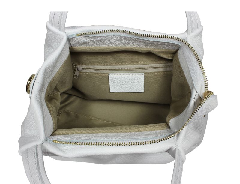Elegantní a praktická bílá kabelka nositelná cross-body (křížem) nebo v ruce. Tato kožená kabelka je uzavíratelná na zip. Uvnitř kabelky najdeme na boční stěně kapsu na zip a přihrádky pro mobil či klíče. Hloubka jejího dna je 13 cm. Kabelka má navíc nastavitelný popruh s maximální délkou cca 120 cm.
