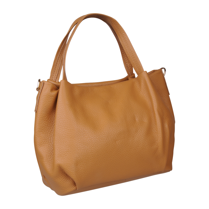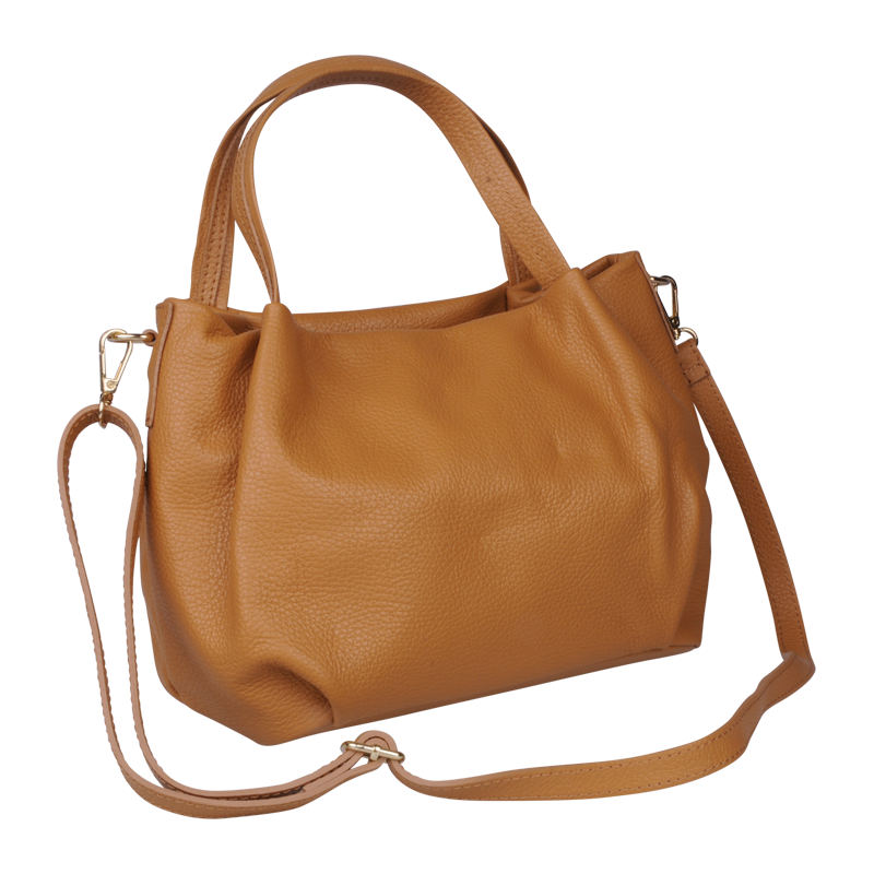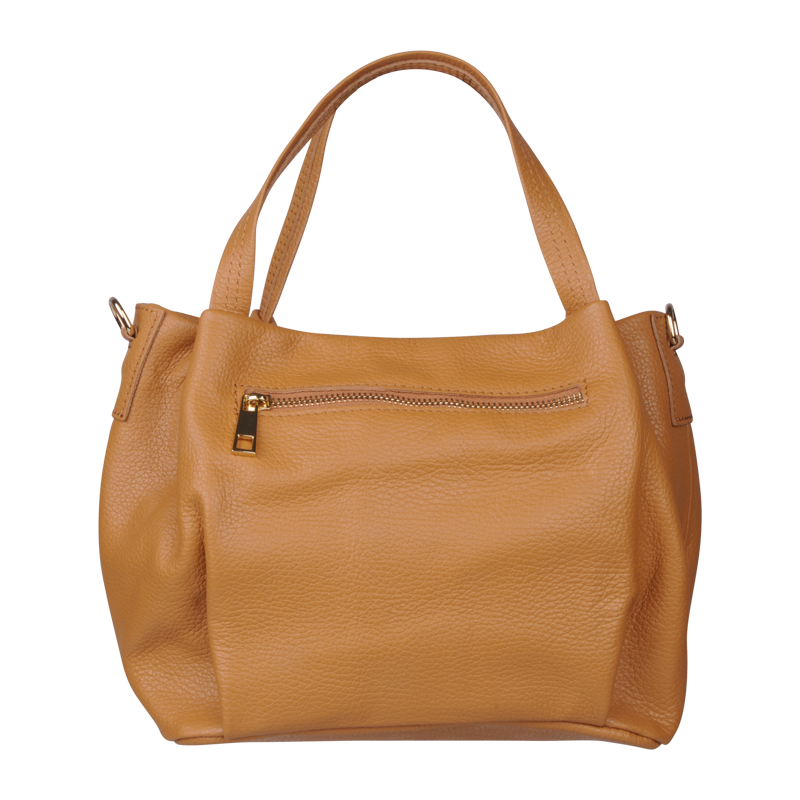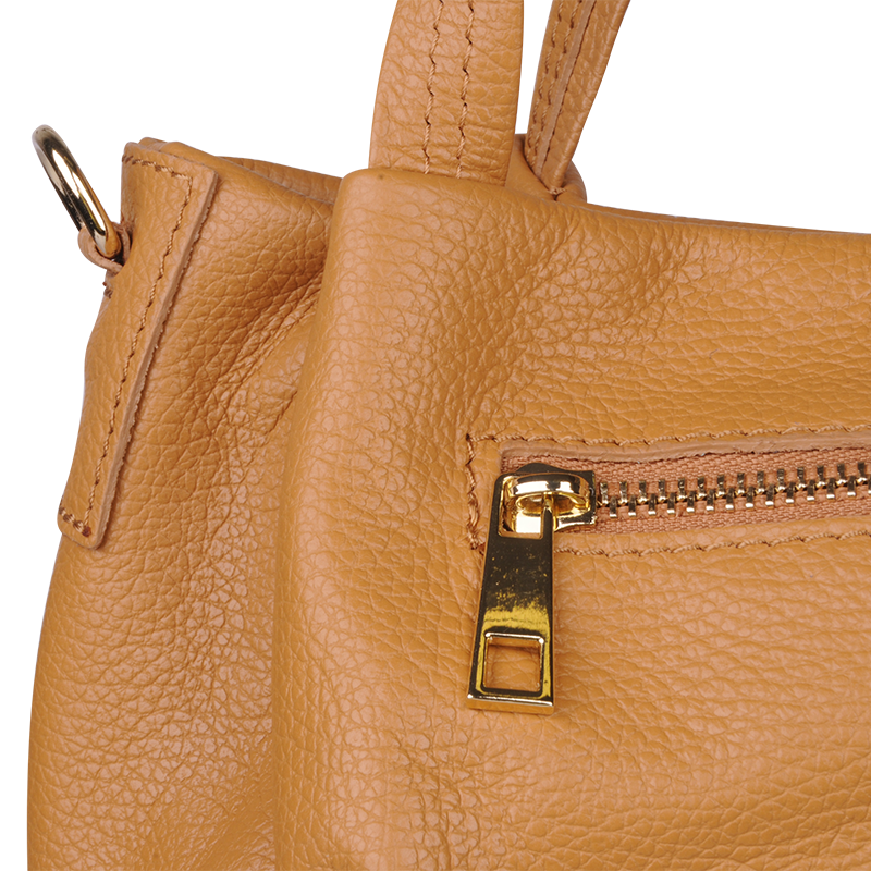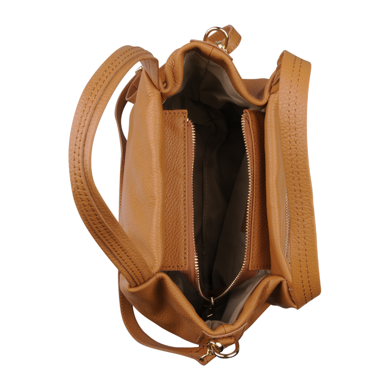 Elegantní a praktická camel kabelka nositelná cross-body (křížem) nebo v ruce. Tato kožená kabelka je uzavíratelná na zip. Uvnitř kabelky najdeme na boční stěně kapsu na zip a přihrádky pro mobil či klíče. Hloubka jejího dna je 13 cm. Kabelka má navíc nastavitelný popruh s maximální délkou cca 120 cm.
