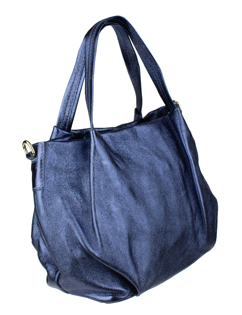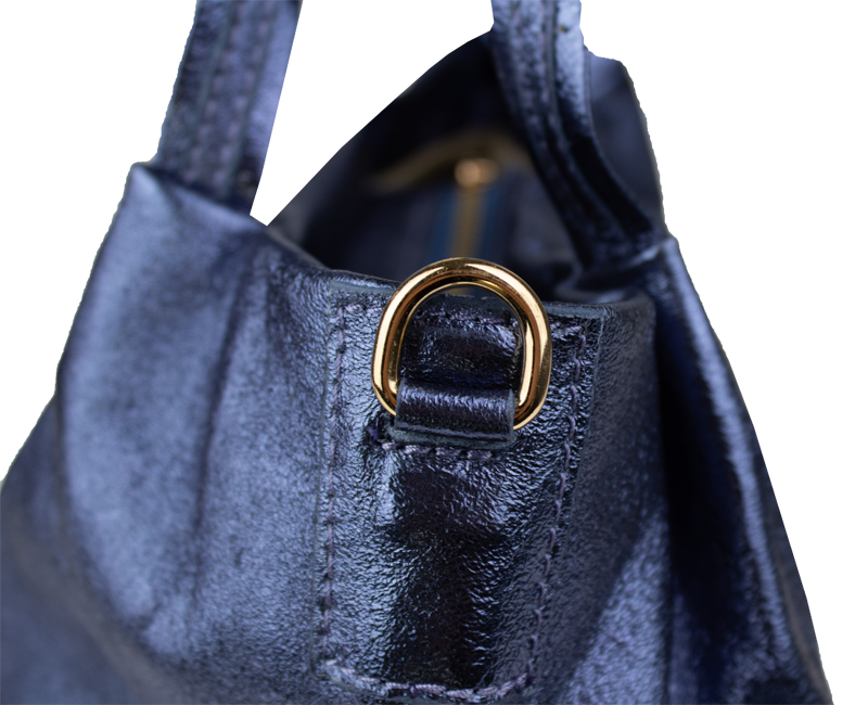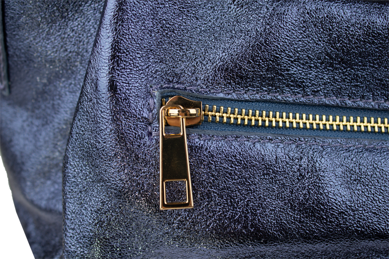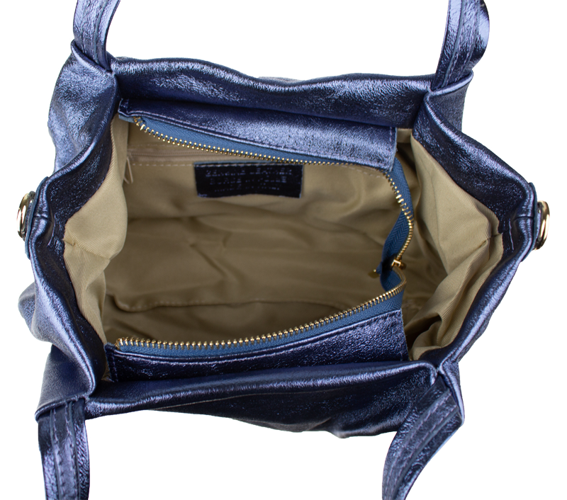 Elegantní a praktická metalicky – modrá kabelka nositelná cross-body (křížem) nebo v ruce. Tato kožená kabelka je uzavíratelná na zip. Uvnitř kabelky najdeme na boční stěně kapsu na zip a přihrádky pro mobil či klíče. Hloubka jejího dna je 13 cm. Kabelka má navíc nastavitelný popruh s maximální délkou cca 120 cm.