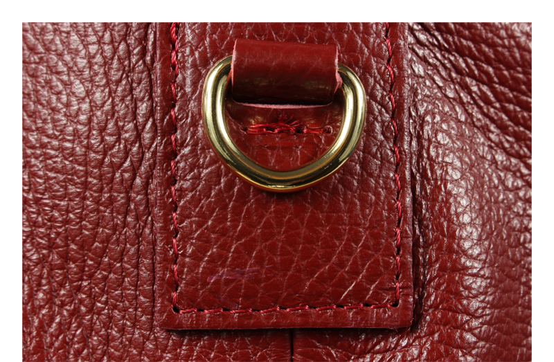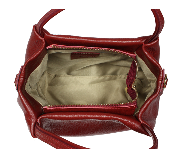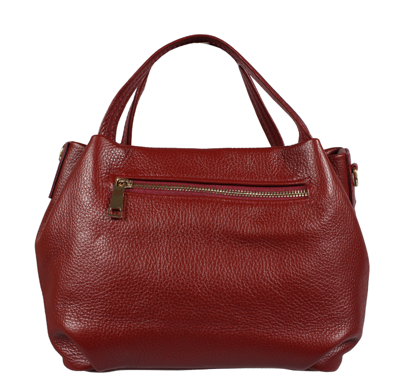 Elegantní a praktická tmavě červená kabelka nositelná cross-body (křížem) nebo v ruce. Tato kožená kabelka je uzavíratelná na zip. Uvnitř kabelky najdeme na boční stěně kapsu na zip a přihrádky pro mobil či klíče. Hloubka jejího dna je 13 cm. Kabelka má navíc nastavitelný popruh s maximální délkou cca 120 cm.