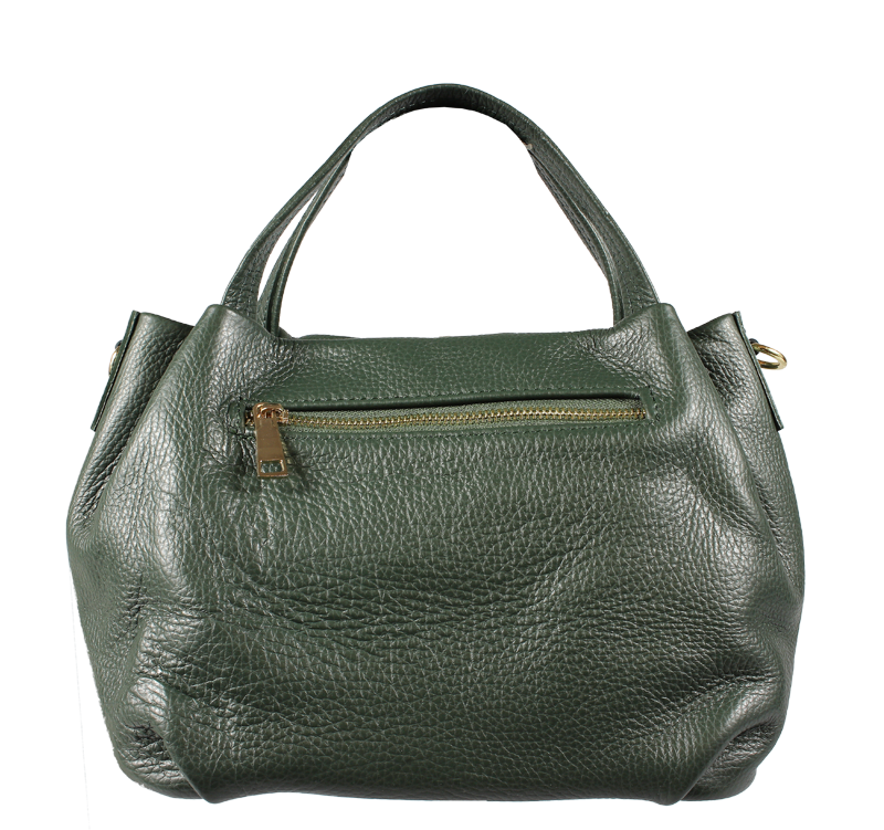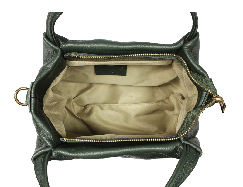 Elegantní a praktická zelená kabelka nositelná cross-body (křížem) nebo v ruce. Tato kožená kabelka je uzavíratelná na zip. Uvnitř kabelky najdeme na boční stěně kapsu na zip a přihrádky pro mobil či klíče. Hloubka jejího dna je 13 cm. Kabelka má navíc nastavitelný popruh s maximální délkou cca 120 cm.