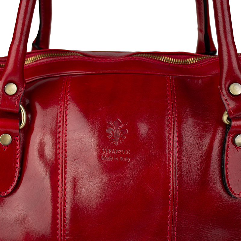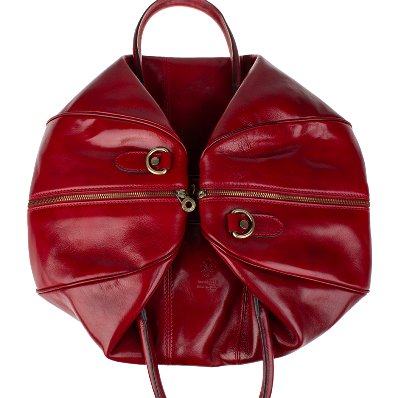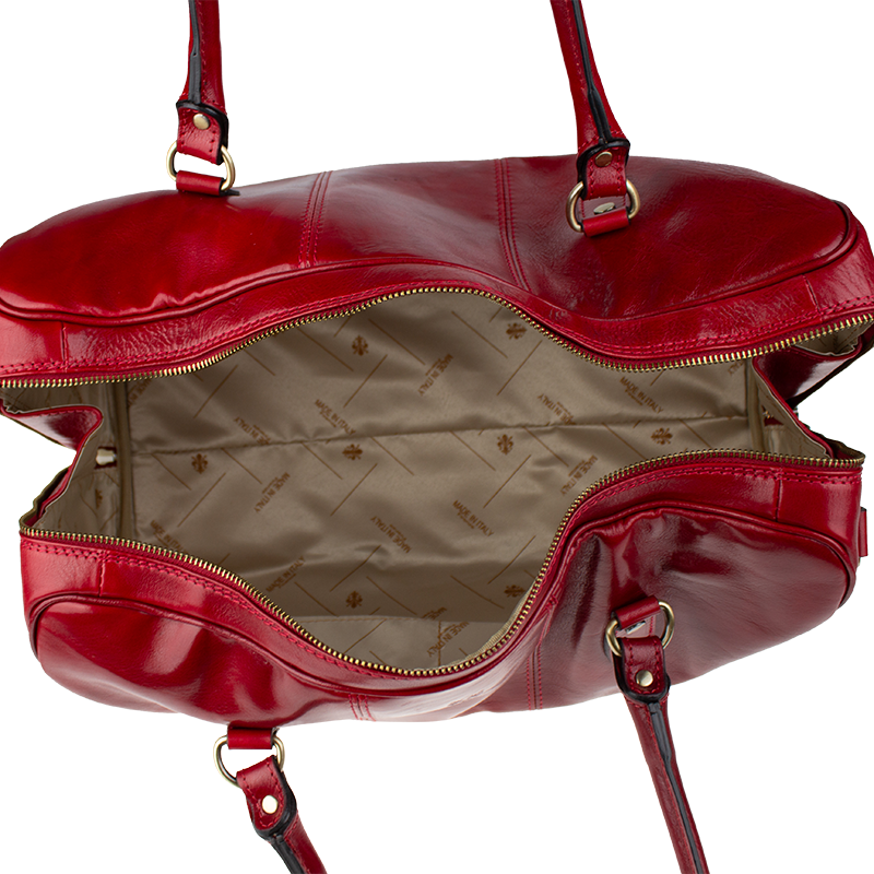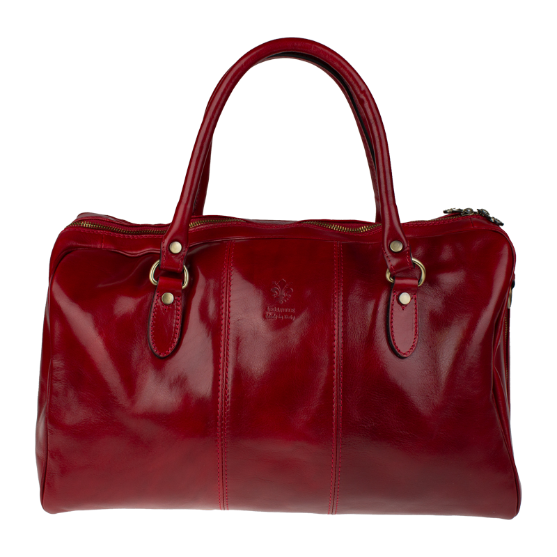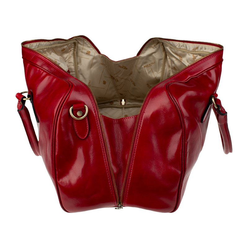 Luxusní kožená cestovní taška v červené barvě. Taška je vyrobena z hladké kvalitní Italské kůže. Součástí tašky je přídavný popruh o délce cca 107 cm. Taška se uzavírá kovovým zipem. Cestujte stylově s koženou taškou!