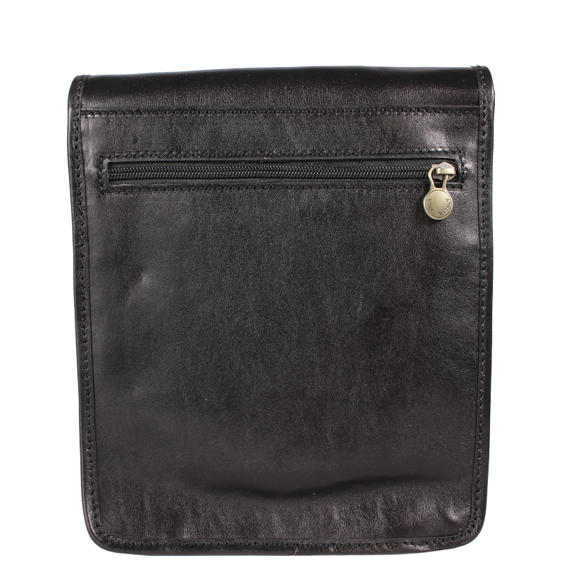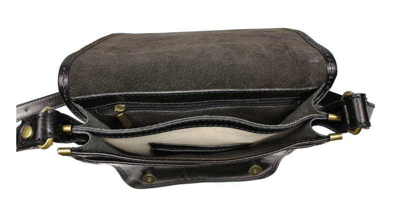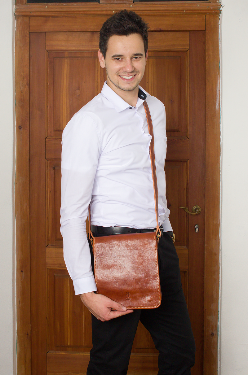 Praktická kožená unisex taška přes rameno. Vnitřek kabelky je rozdělen na tři přihrádky a kapsu na zip. Kabelka se uzavírá klopou pomocí dvou magnetických patentek. Délka popruhu je 130 cm.