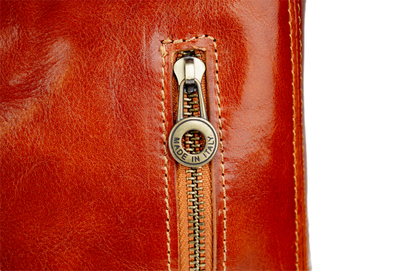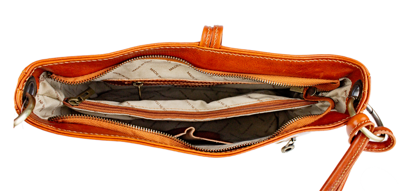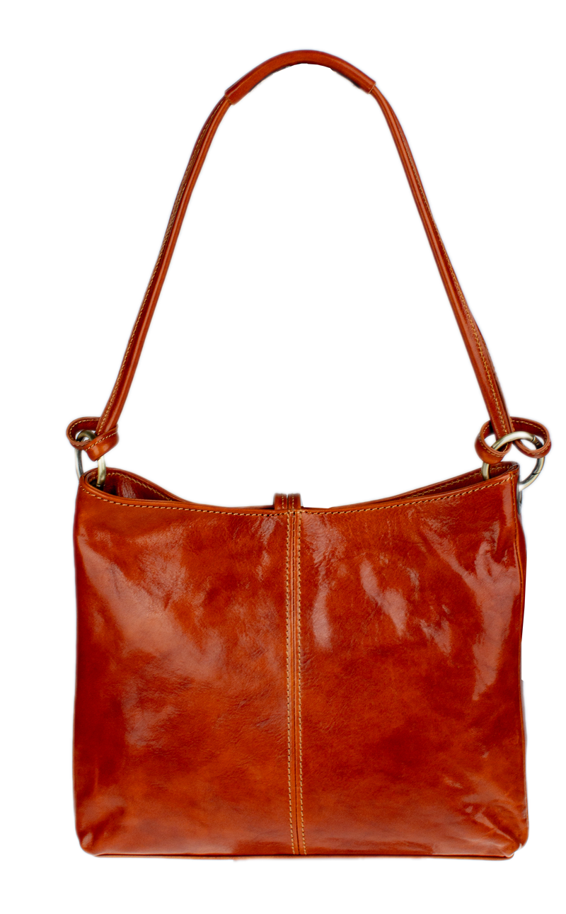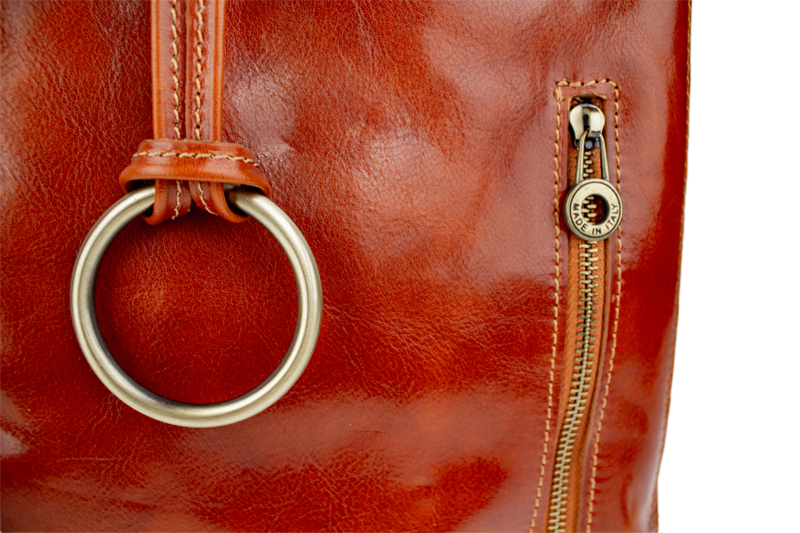 Camel středně velká kabelka klasického designu nositelná přes rameno. Na boku najdeme vertikální kapsu na zip. Tato kožená kabelka je uzavíratelní na zip a dále disponuje také ozdobou – kroužkem, který se překlápí přes zip a drží tak kabelku také zavřenou. Hloubka jejího dna je 9 cm.